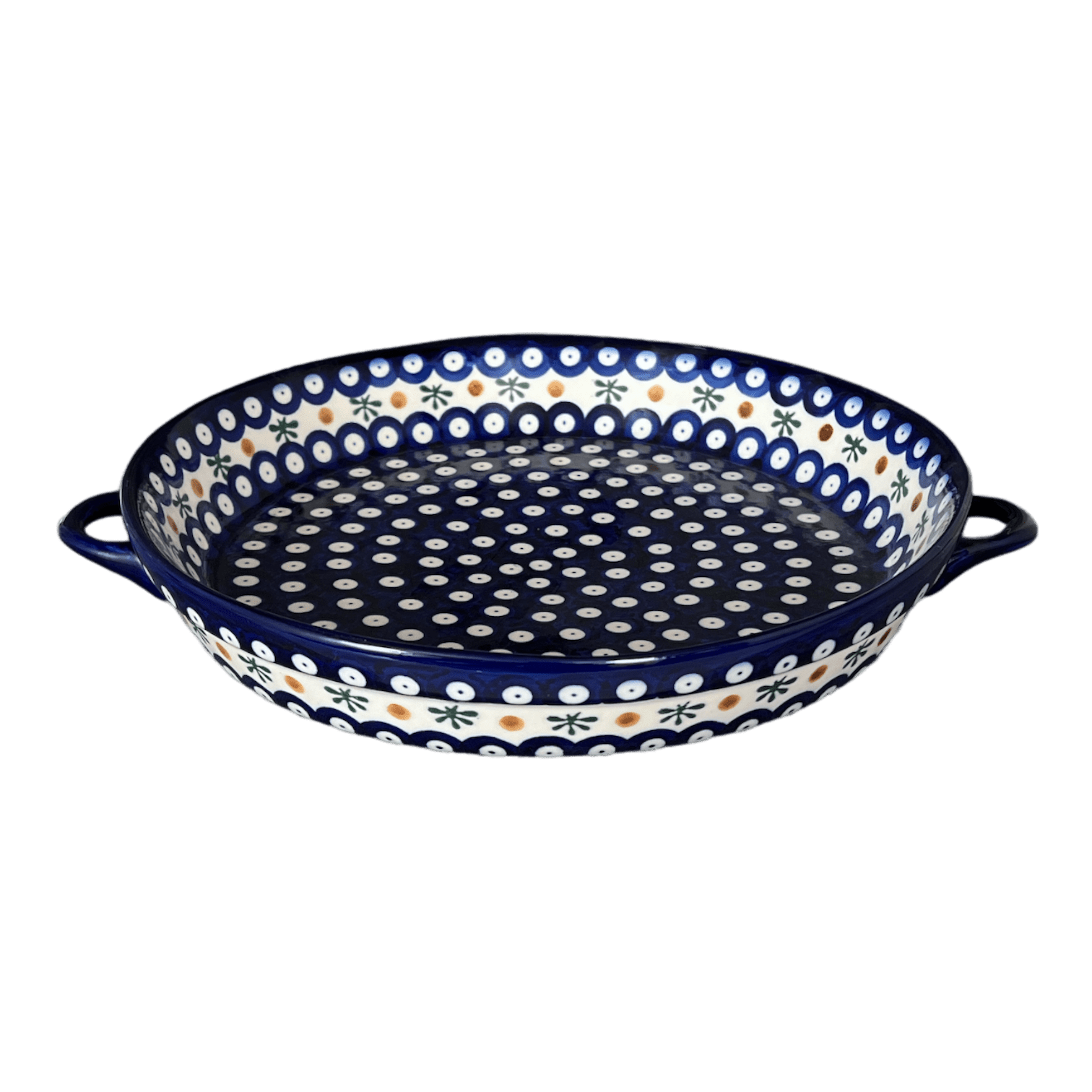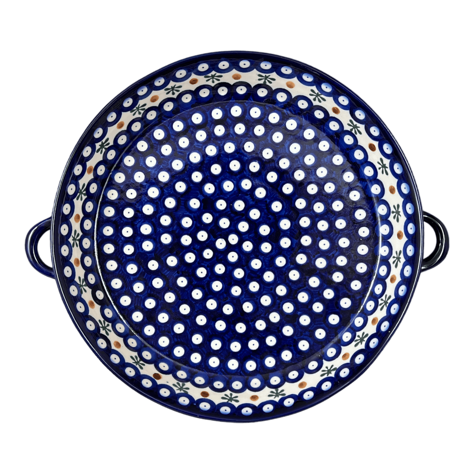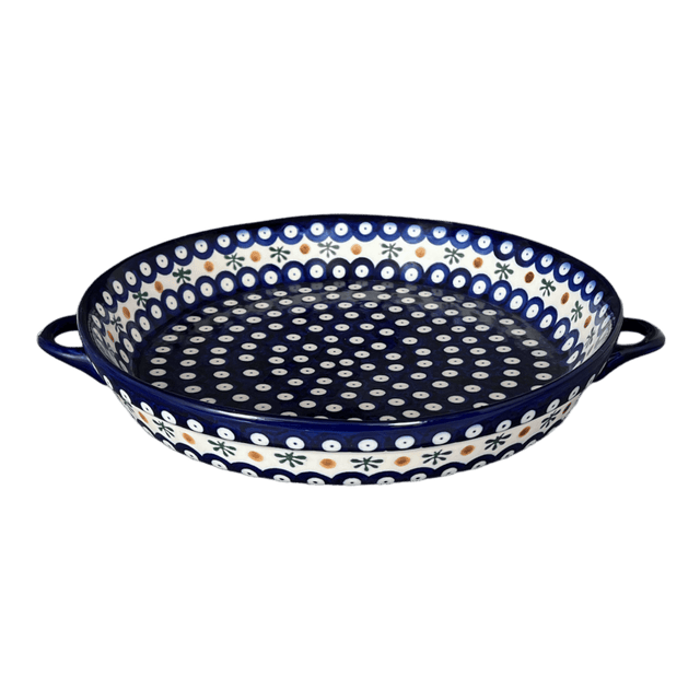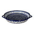 Imagine a delightful evening with your loved ones, where the centerpiece of your table is the stunning Polish Pottery Casserole dish, artfully adorned with the whimsical "Mosquito" pattern. Crafted by the skilled artisans of W.R. Ceramika in Boleslawiec, Poland, this 11-inch round dish with handles is not just a cooking vessel but a conversation starter. The eye-catching design features a vibrant cobalt blue backdrop with playful white polka dots, complemented by a unique band of brown dots and charming green "mosquitoes." It’s a perfect blend of function and style, making it an irresistible addition to any kitchen.