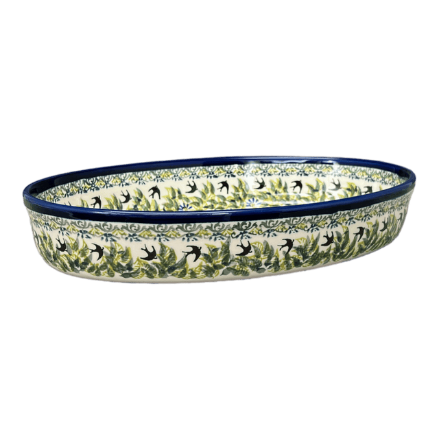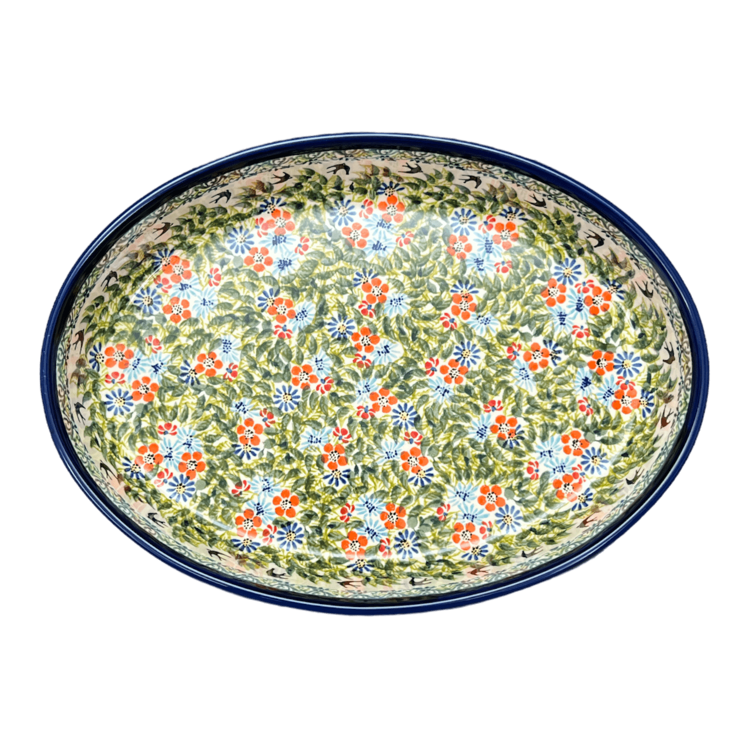 Imagine the enchantment of a vibrant garden captured on your dinner table with the exquisite Zaklady Polish Pottery Baker! This 12.25" oval masterpiece, adorned with the "Floral Swallows" pattern, transforms everyday baking into an artistic display. Whether you're whipping up a golden-brown lasagna or a moist chocolate cake, this baker handles it all with elegance. Its delightful design features whimsical black swallows circling a burst of bright orange, blue, and red flowers, set against a serene light blue background, sprinkled with hints of green, orange, and red accents.