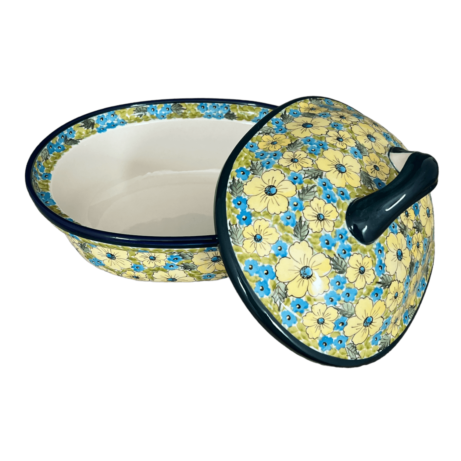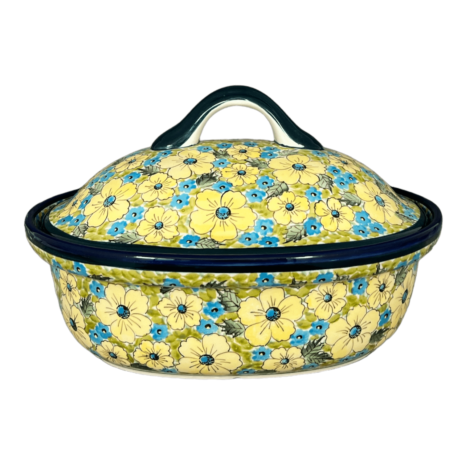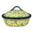Imagine a kitchen where the vibrancy of summer meadows dances on your dinner table! Introducing the Zaklady Polish Pottery Baker in the "Sunny Meadow" pattern, a delightful blend of function and art. Measuring a generous 12.5" x 10", this large covered baker is perfect for those hearty family meals. Whether it's succulent roasted meats or a medley of roasted vegetables, this piece turns every cooking endeavor into a festive occasion. The "Sunny Meadow" design features a playful dance of large yellow flowers and dainty blue blossoms set against a lush green background, bringing a burst of color and joy to your kitchen decor.