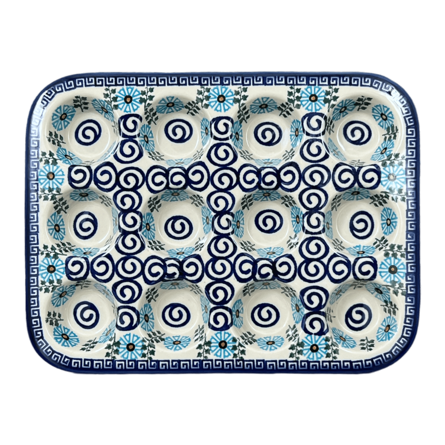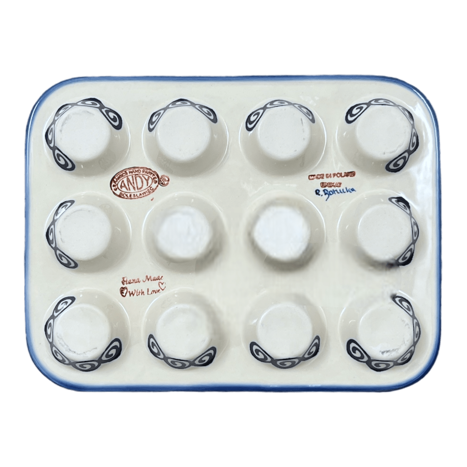 Introducing the enchanting Polish Pottery Muffin Pan by Andy, a piece that turns your baking days into a delightful adventure! The "Blue Daisy Spiral" pattern, a visual symphony of light blue flowers encircling dark blue spirals, brings the serene beauty of a blooming garden right into your kitchen. Crafted in the quaint town of Boleslawiec, Poland, this 12-cup mini muffin pan not only promises exquisitely moist muffins and cupcakes but also adds a splash of traditional artistry to your bakeware collection. The high gloss glaze ensures that your sweet treats will slide out effortlessly, ready to charm your taste buds and dazzle your guests.