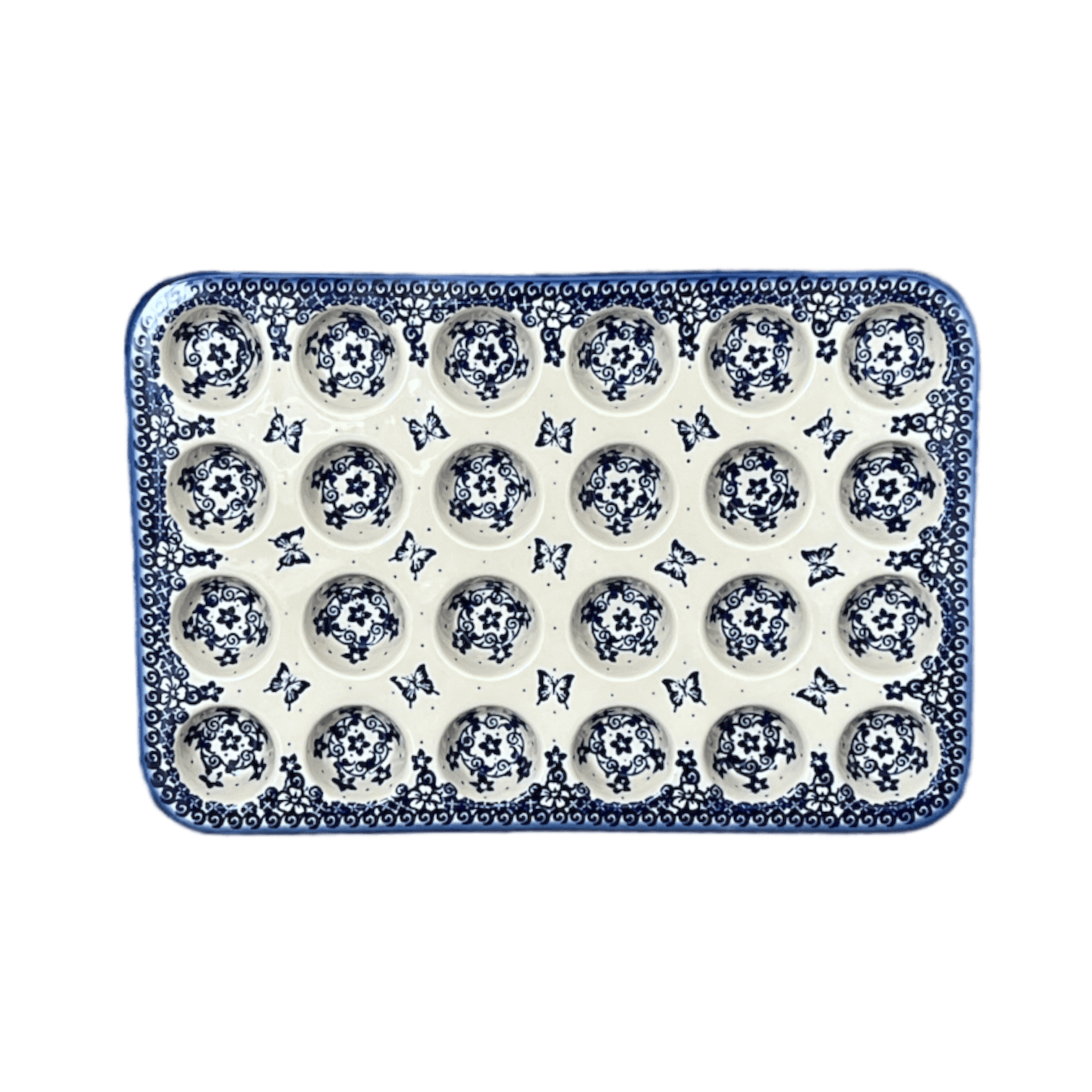 Step into the world of culinary delights with the exquisite Polish Pottery Muffin Pan, featuring the enchanting "Butterfly Blues" pattern by the renowned artisan, Andy. Imagine the joy of pulling out perfectly moist mini muffins or cupcakes, each one a tiny testament to your baking prowess, thanks to the pan's superb craftsmanship. The high gloss glaze not only adds a sparkle to your kitchen but also ensures that your baked goods slide out effortlessly, ready to charm your taste buds and dazzle your guests. The "Butterfly Blues" design, with its playful dance of blue butterflies and delicate flowers on a crisp white background, transforms each baking session into a whimsical art display.