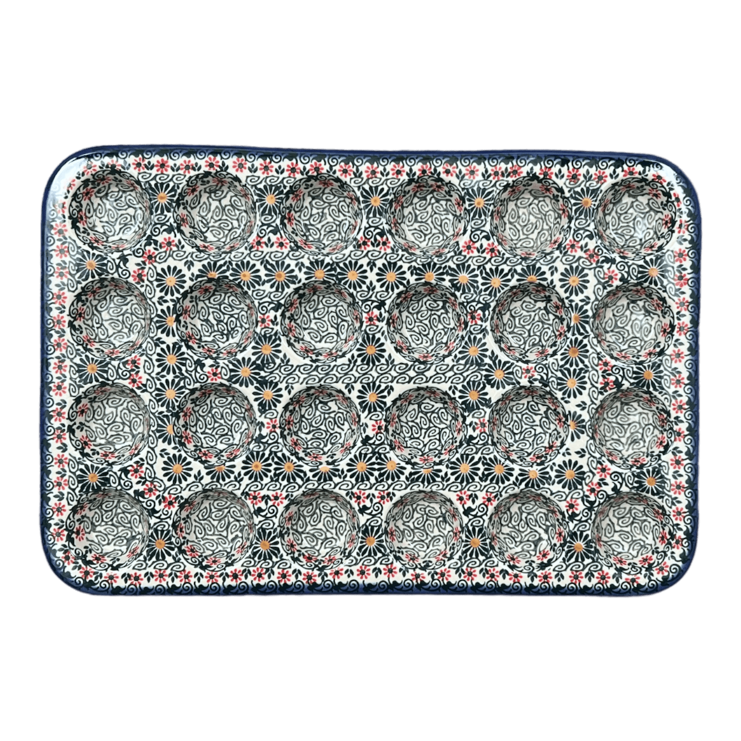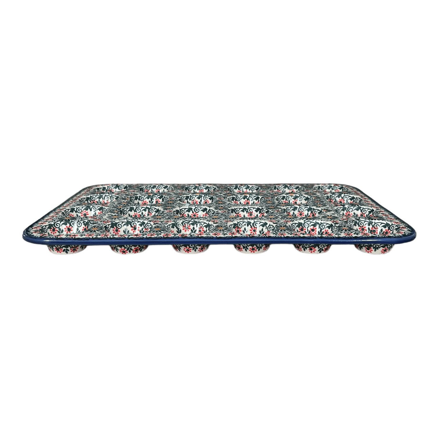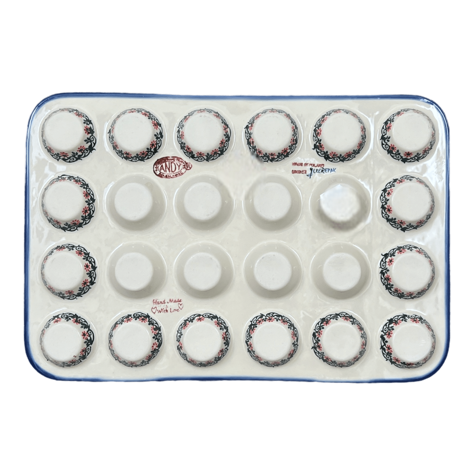 Imagine waking up to the sweet scent of freshly baked mini muffins, each one perfectly moist and bursting with flavor. Now, picture these delightful treats effortlessly sliding out of a stunningly beautiful muffin pan that not only bakes but also beautifies your kitchen. Introducing the Polish Pottery Muffin Pan, crafted by the talented Andy in the enchanting "Garden Breeze" pattern. This 24-cup mini muffin pan, measuring an ample 17" x 11.25", is not just a baking essential but a piece of art. Adorned with large green flowers and golden centers, surrounded by an intricate dance of green leaves, vines, and swirls, with charming tiny pink flowers scattered throughout, it brings the beauty of a spring garden right into your home.