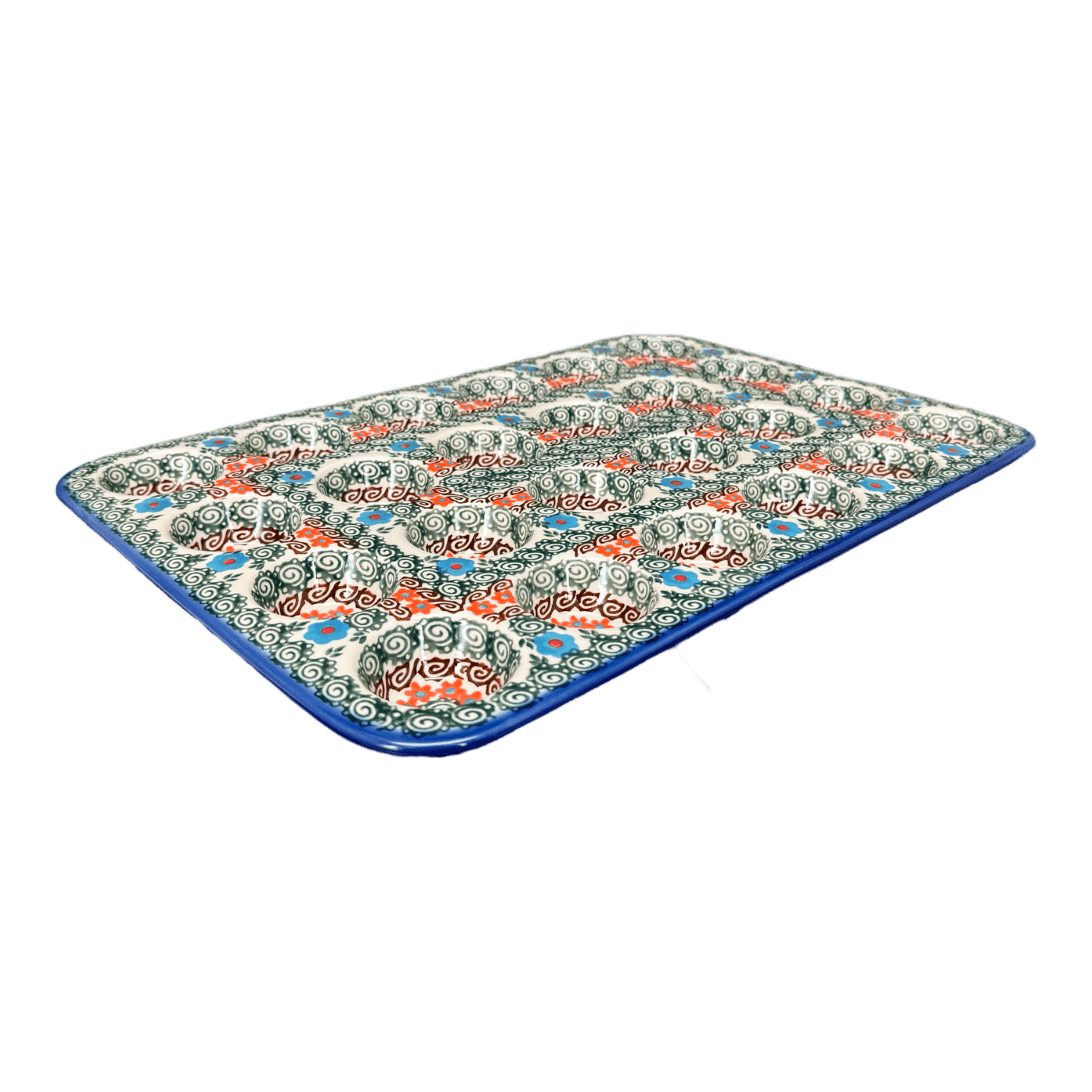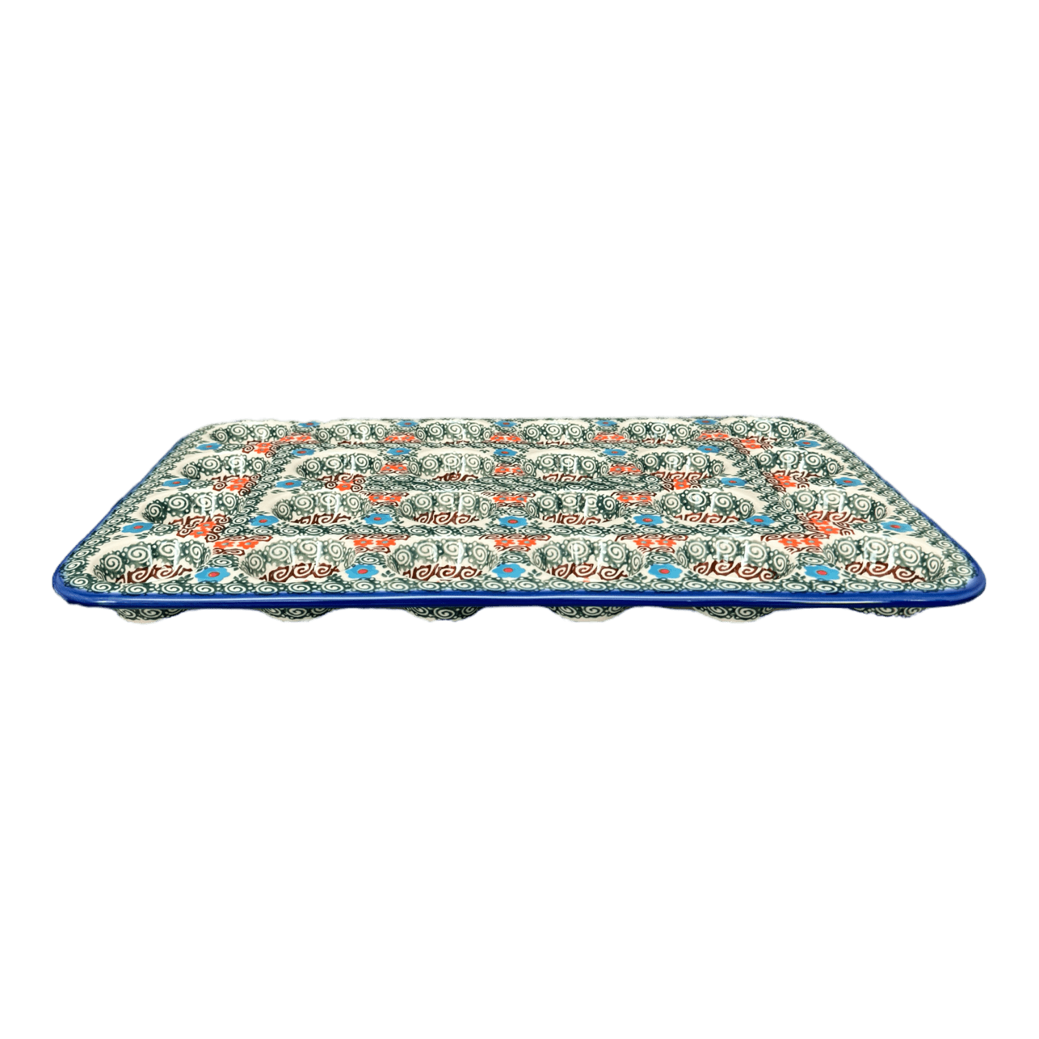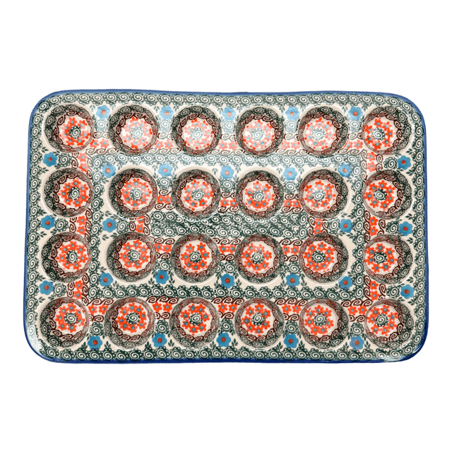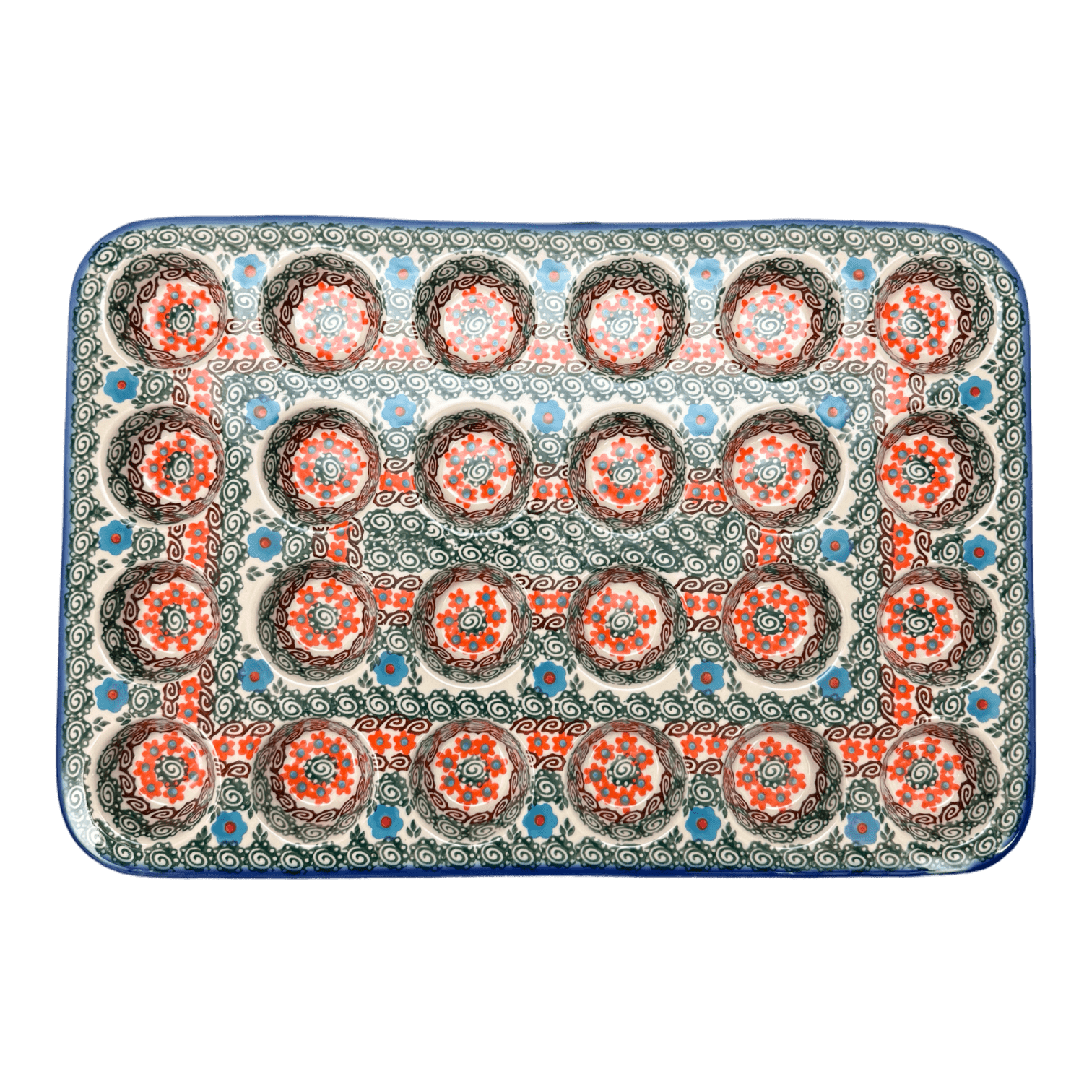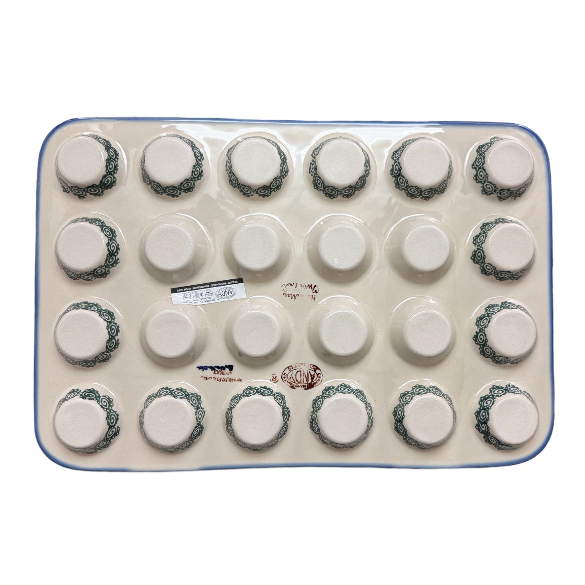 Introducing the delightful Polish Pottery Muffin Pan, a true masterpiece from the renowned artisan Andy! With its charming "Teal Pompons" pattern, this 24-cup mini muffin pan is not just a baking tool but a piece of art. Measuring 17" x 11.25", each mini muffin cup promises your baked goods will be moist, flavorful, and effortlessly slide right out, thanks to the high-gloss glaze. Picture your kitchen alive with the vibrant teal, green, and orange hues, as flowers and spirals dance across the surface, bringing the joy of spring right into your home!