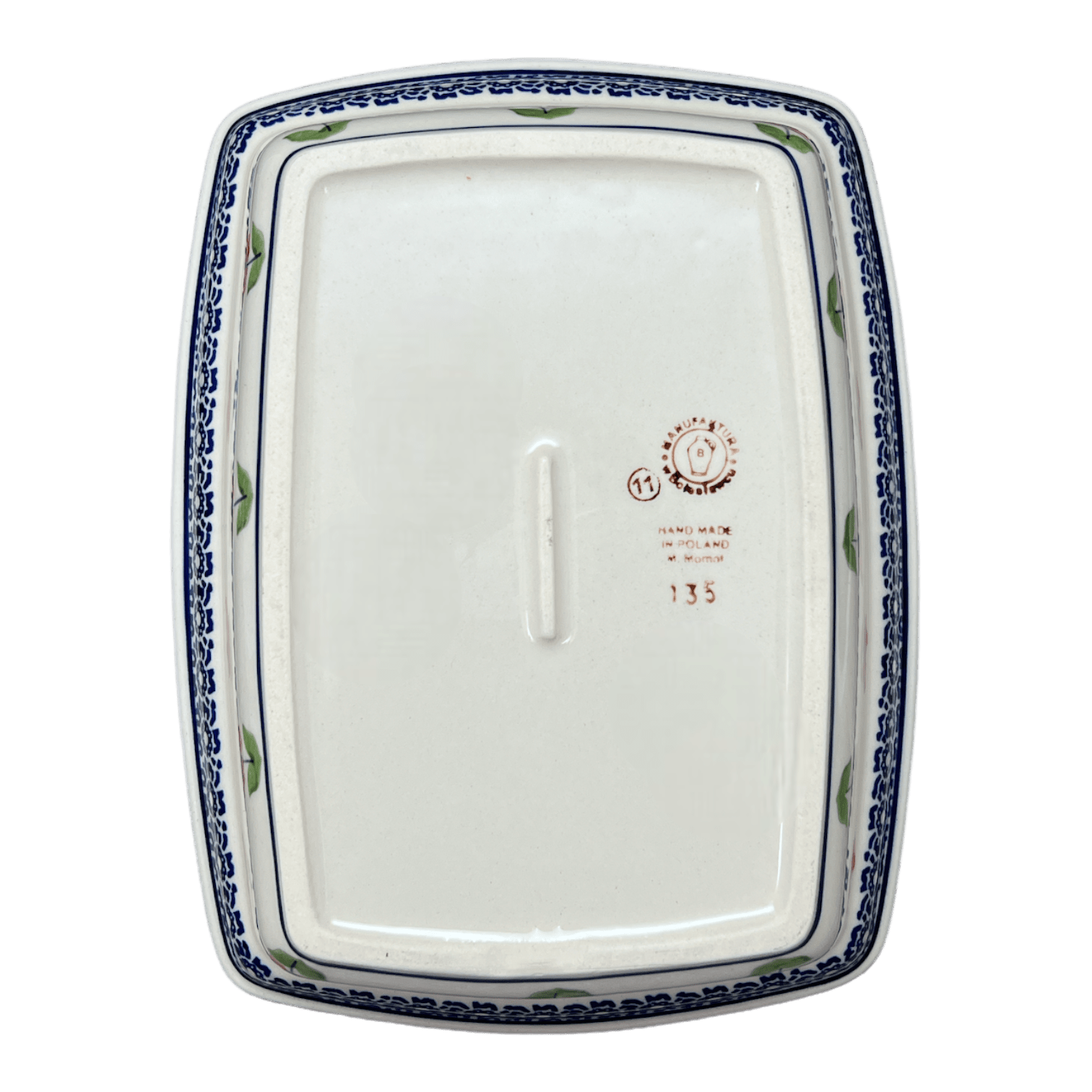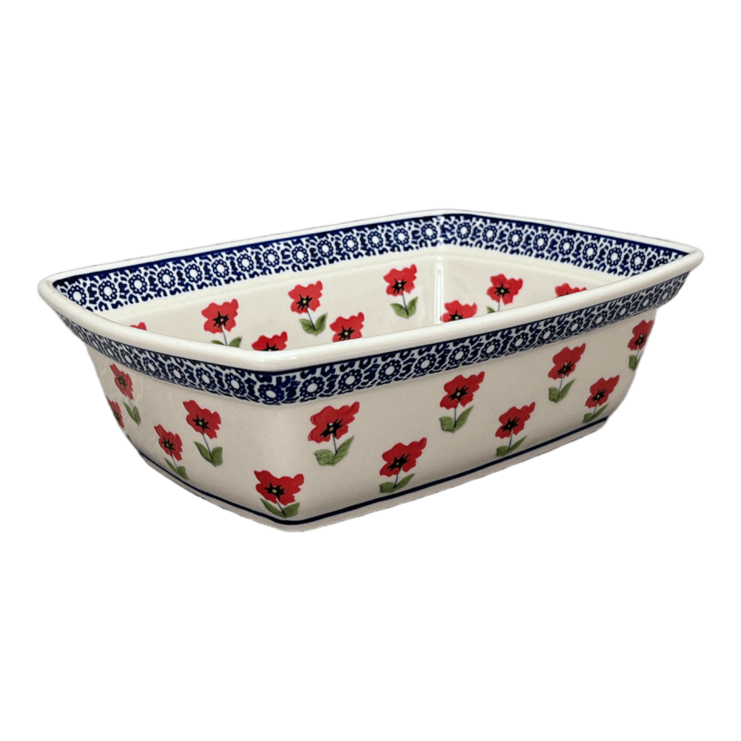 Imagine your kitchen transforming into a vibrant canvas of colors with the enchanting Manufaktura Polish Pottery Casserole! This exquisite piece, measuring 7.5" x 10", isn't just a casserole dish; it's a masterpiece hand-painted in the breathtaking "Poppy Garden" pattern. The pattern bursts with the vivid beauty of simple white flowers set against a serene blue background, encircled by a lively band of large poppies with green stems, dancing on a white canvas. Every meal becomes a celebration of artistry and tradition, as this pattern hails from the Traditional level of Polish pottery, renowned for its timeless appeal and broad recognition.