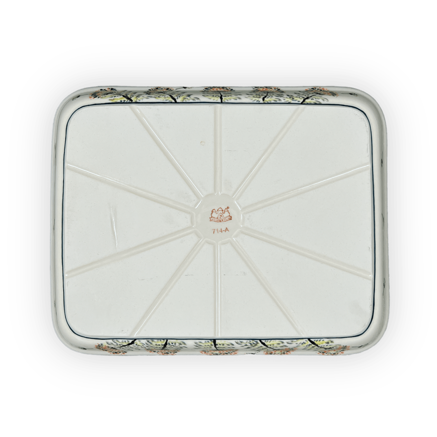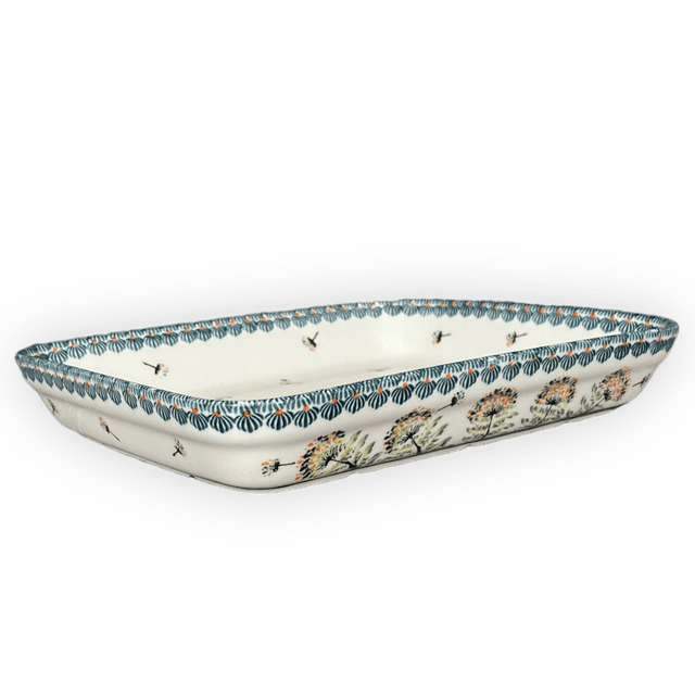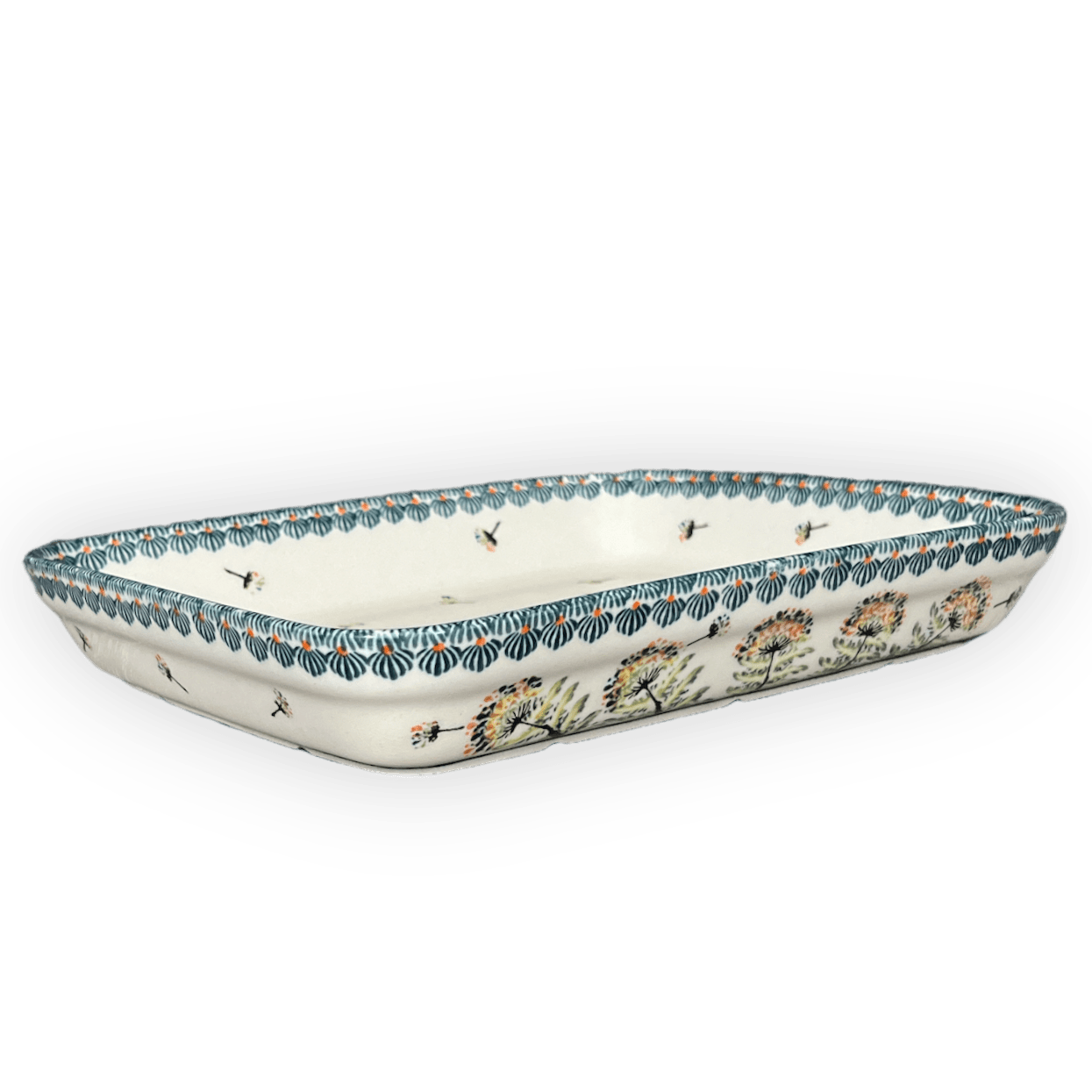 Imagine serving your famous brownies or that family-favorite lasagna in a piece that's not just cookware but a conversation starter. Enter the Polish Pottery Baker, Rectangular (9" x 11.75"), from Zaklady, adorned with the vibrant "Dandelions" pattern. This isn't your ordinary kitchenware! Picture tall, cheerful dandelions in shades of orange, yellow, and green, stretching up from slim green stems, their fluffy seeds dancing around against a crisp white backdrop framed by a lively green and orange border. It’s like a spring meadow right in your kitchen, turning every meal into a sunny garden picnic.