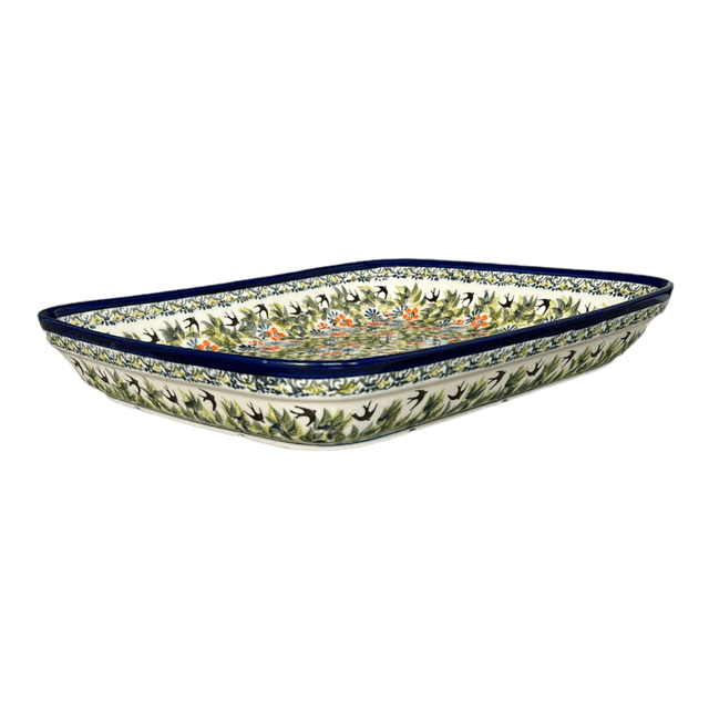 Imagine serving your famous lasagna or a bubbling cobbler in a piece of art that captures the essence of a vibrant Polish spring. The Zaklady Polish Pottery Baker, in its stunning "Floral Swallows" pattern, does just that! This rectangular baker, measuring a generous 10.5" x 13", is not just a dish but a centerpiece that brings the art of Polish pottery to your table. Decorated with graceful black swallows circling a lively array of orange, blue, and red flowers against a soft light blue backdrop, this dish turns every meal into a festive occasion. The lively green, orange, and red accents bring a pop of color that complements any decor.
