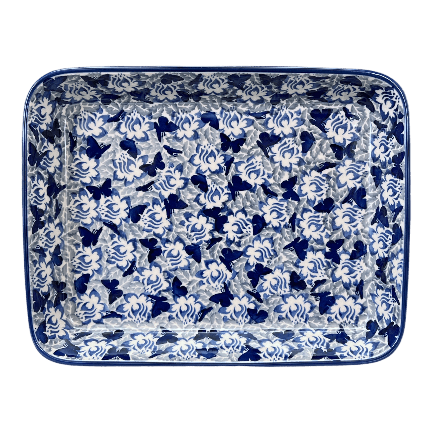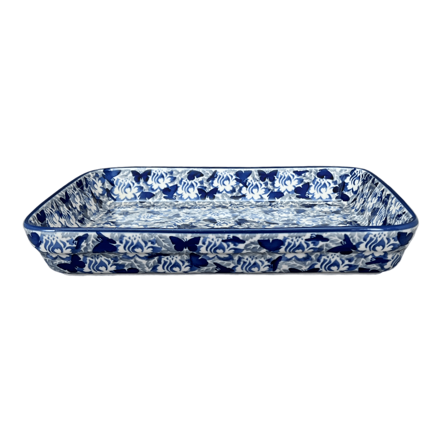 Baker, Rectangular, Shallow, 9" x 11" in "Dusty Blue Butterflies" by Manufaktura | P104U-AS56 is backordered and will ship as soon as it is back in stock.