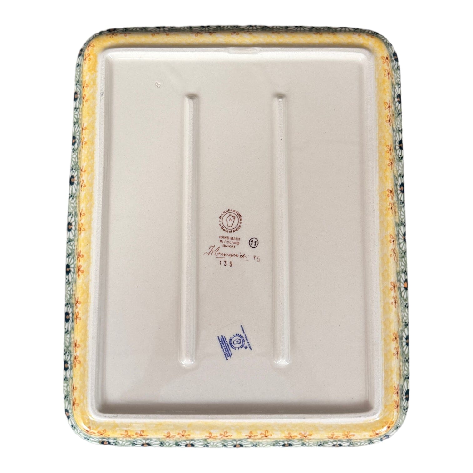Polish Pottery is Dishwasher safe! Or, clean by hand using regular dish soap and scrub brush.
