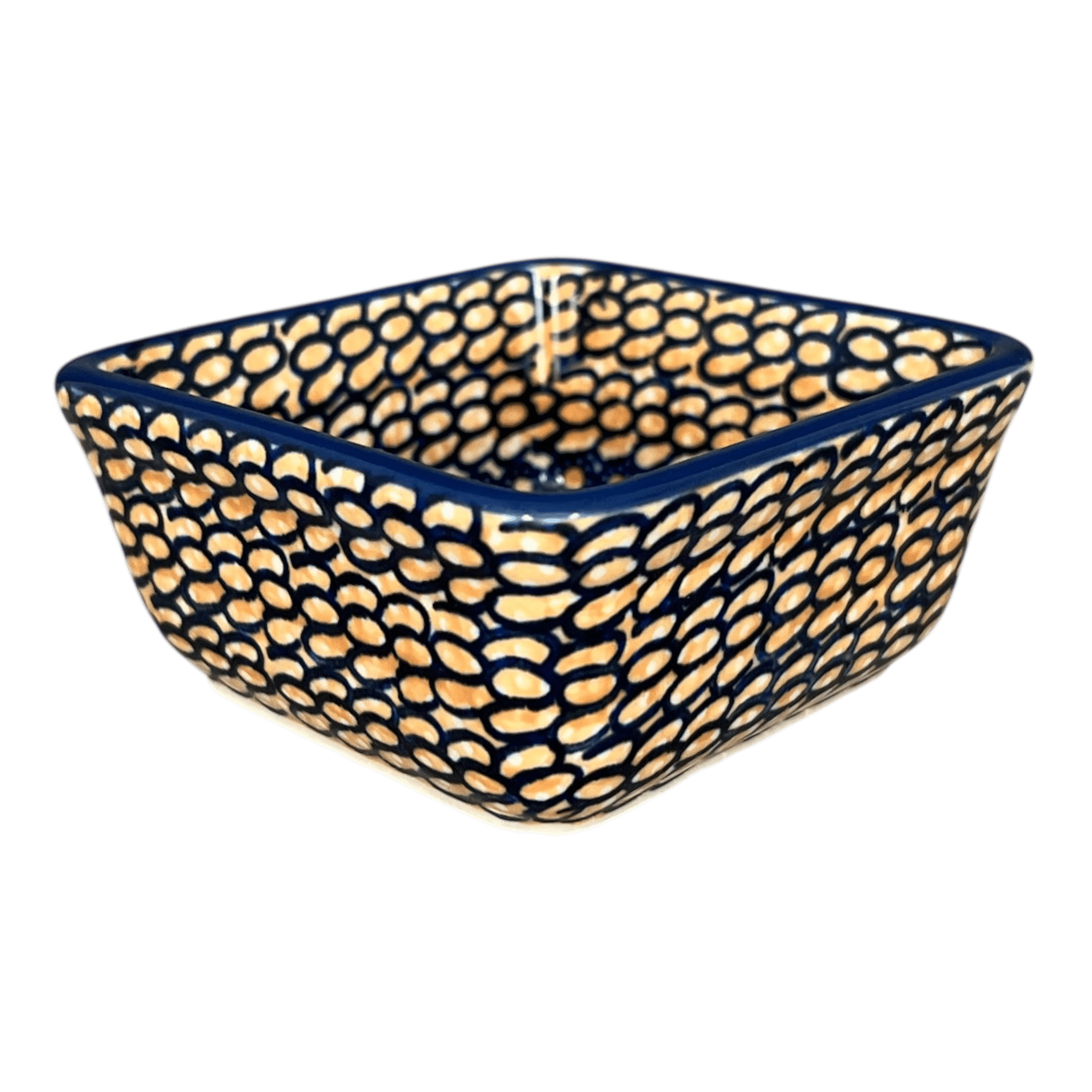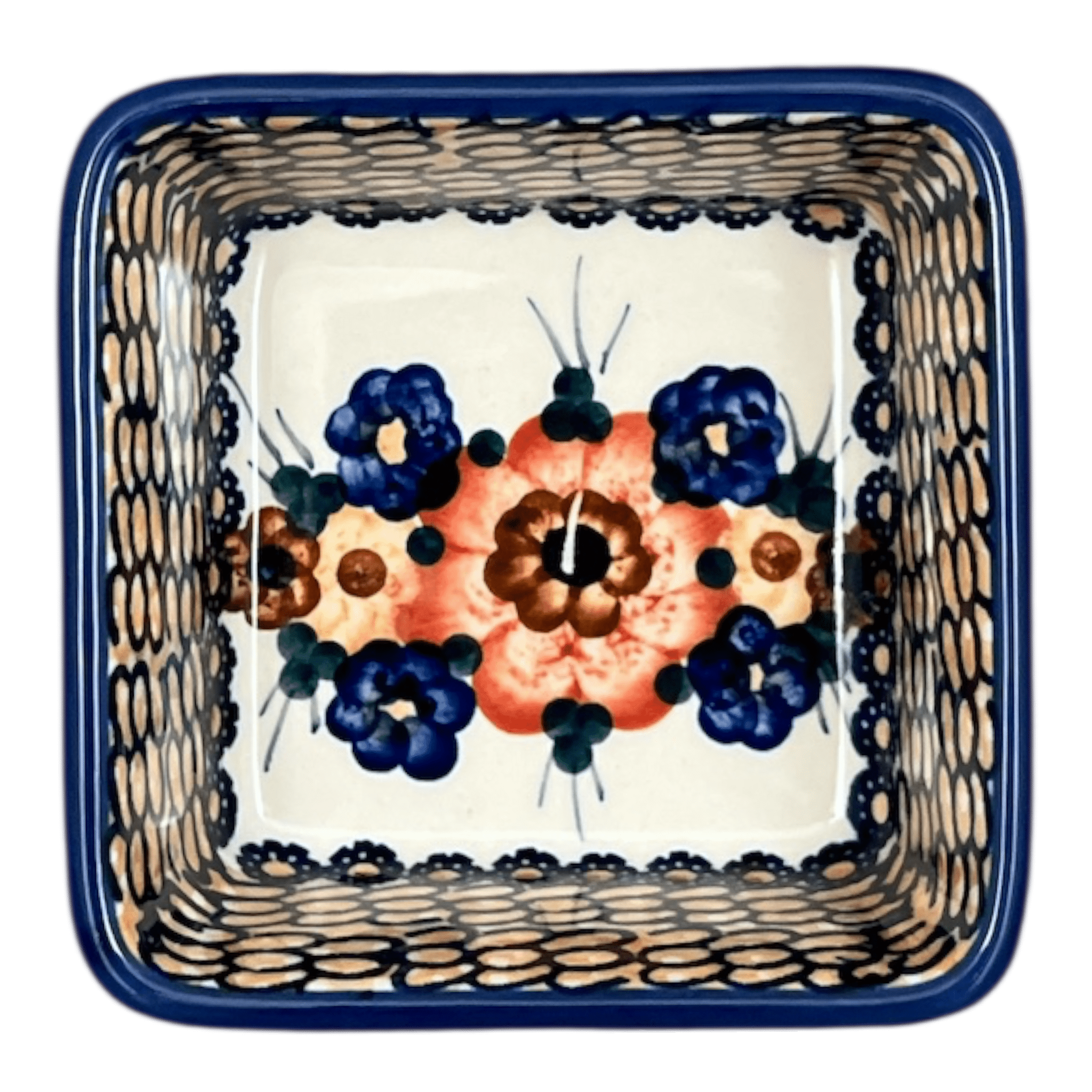Introducing the enchanting Manufaktura 3.5" Square Baker, a piece that transcends mere functionality to become a canvas of artistic expression! This exquisite Polish pottery, adorned with the "Bouquet in a Basket" pattern, is not just a baker—it's a versatile marvel. Imagine it as a charming 10 oz ramekin, a quaint individual baker, or even a whimsical holder for your colorful post-it notes. The fun doesn’t stop there; nestle four of these beauties inside the larger 8" x 8" Square Baker (#P151) to create a stunning five-piece set that’s sure to captivate and impress. With its vibrant palette of browns, blues, peaches, and whites, this baker brings a burst of countryside charm right into your kitchen.