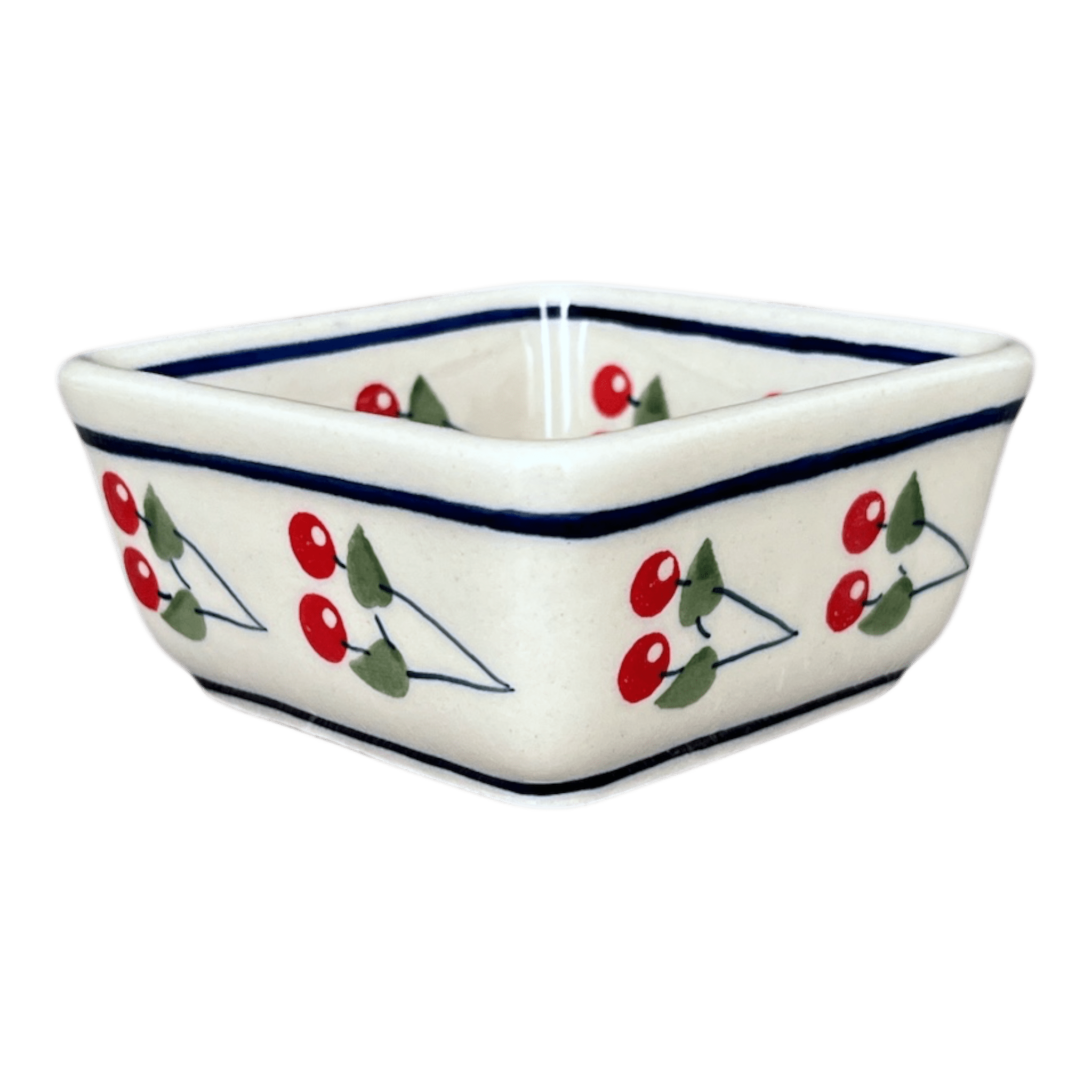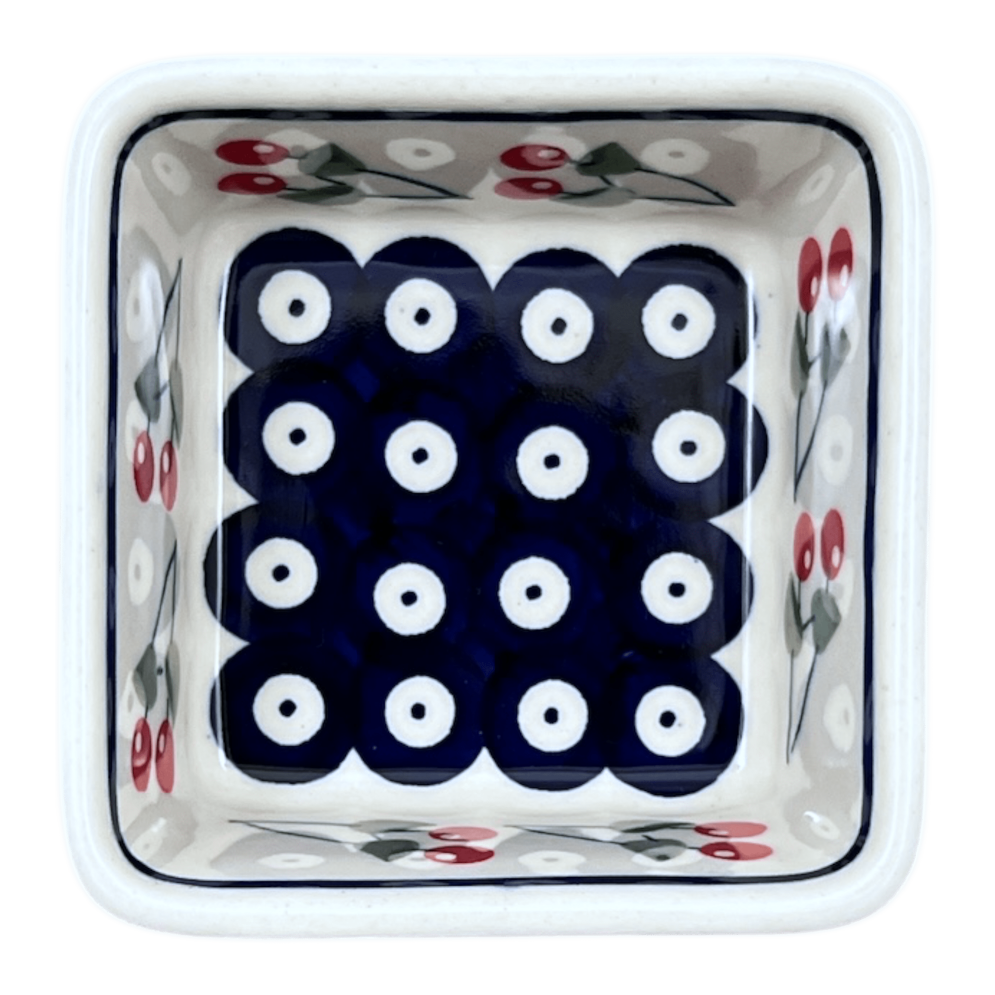 Introducing the enchanting Polish Pottery Baker, a 3.5" square marvel of craftsmanship by Manufaktura, showcasing the delightful "Cherry Dot" pattern (70WI). This charming baker is not just a feast for the eyes but also a testament to versatility. Imagine using it as a quaint 10 oz ramekin for your decadent desserts, an individual baker for your culinary creations, or even as a stylish holder for your post-it notes! And for those who love a coordinated kitchen, nestle four of these beauties inside the 8" x 8" Square Baker (#P151) to create a stunning five-piece set that will make any countertop look festive.