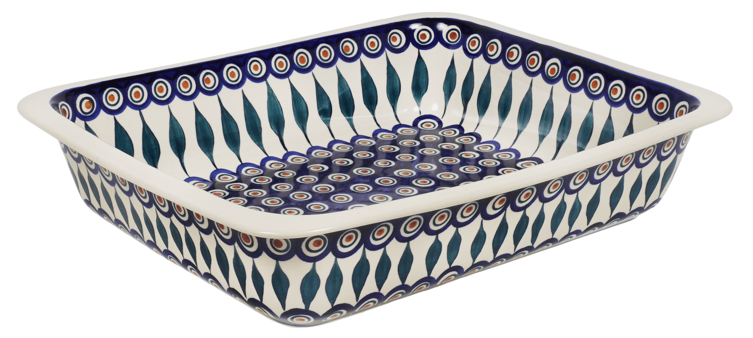 This exquisite piece is crafted in Boleslawiec, Poland, where skilled artisans use the ancient "punching" technique of hand stamping to breathe life into each design. The "Peacock" pattern is a testament to the traditional level of artistry that Polish pottery is renowned for—simple yet endlessly enchanting. Each baker is hand-painted, ensuring that no two pieces are exactly alike. This variability adds a unique charm to your kitchen collection, allowing you to own a distinct piece of Polish heritage. Functional as well as beautiful, this lasagna pan is designed to withstand the demands of a modern kitchen, being safe for use in the dishwasher, microwave, freezer, and oven up to 425 degrees.