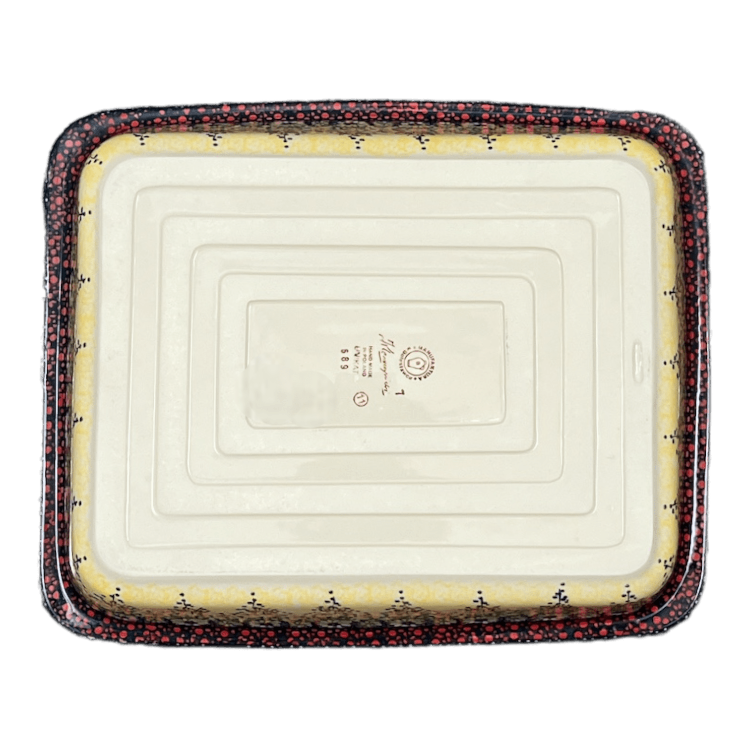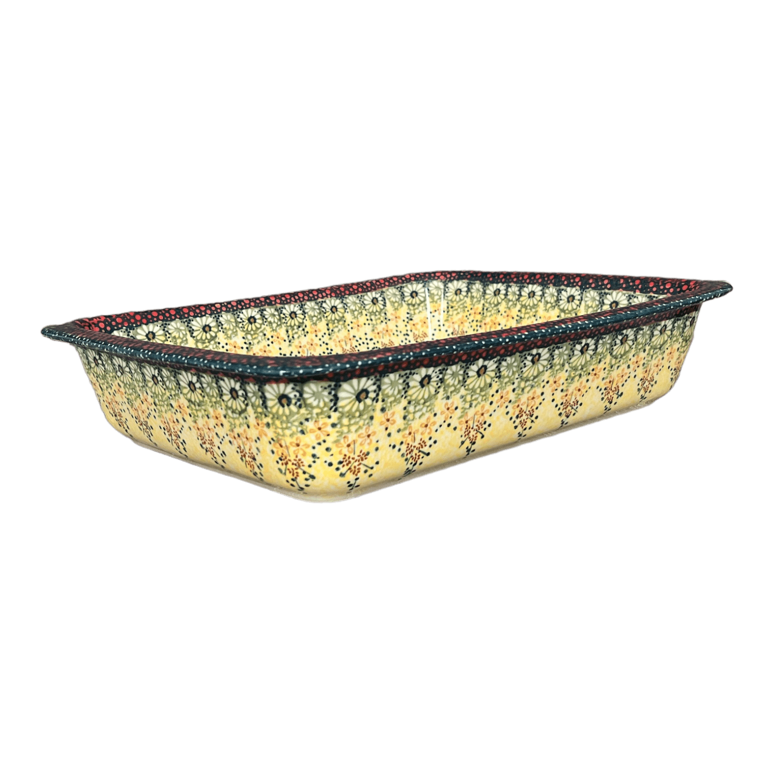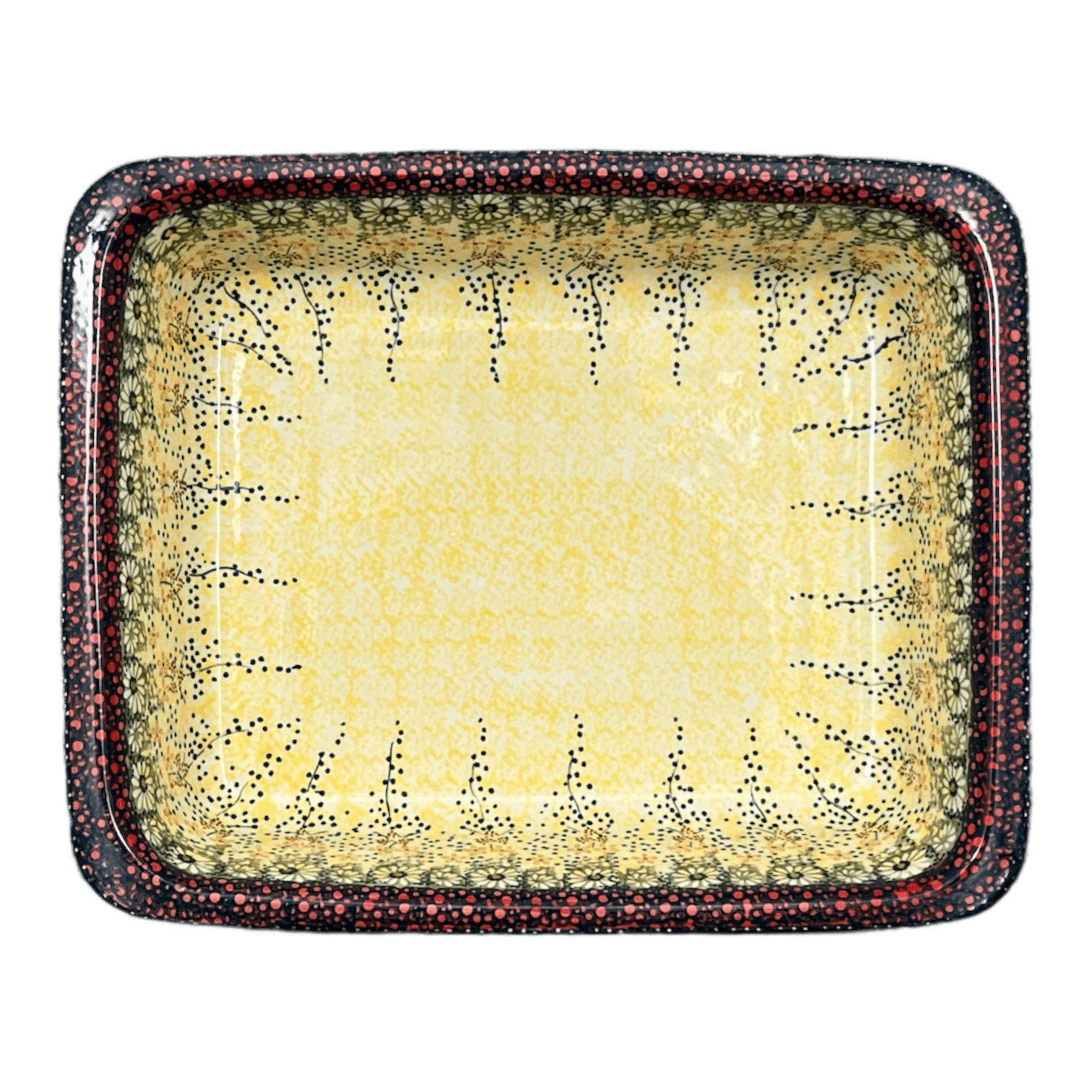 Looking to add some sunshine to your kitchen? Look no further than the Polish Pottery 11" x 14" Lasagna Baker in the "Sunshine Grotto" pattern! This deep dish baker is perfect for family-sized meals and makes baking a breeze. The bright yellow background with accents of green and red will bring a pop of color to your table.