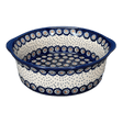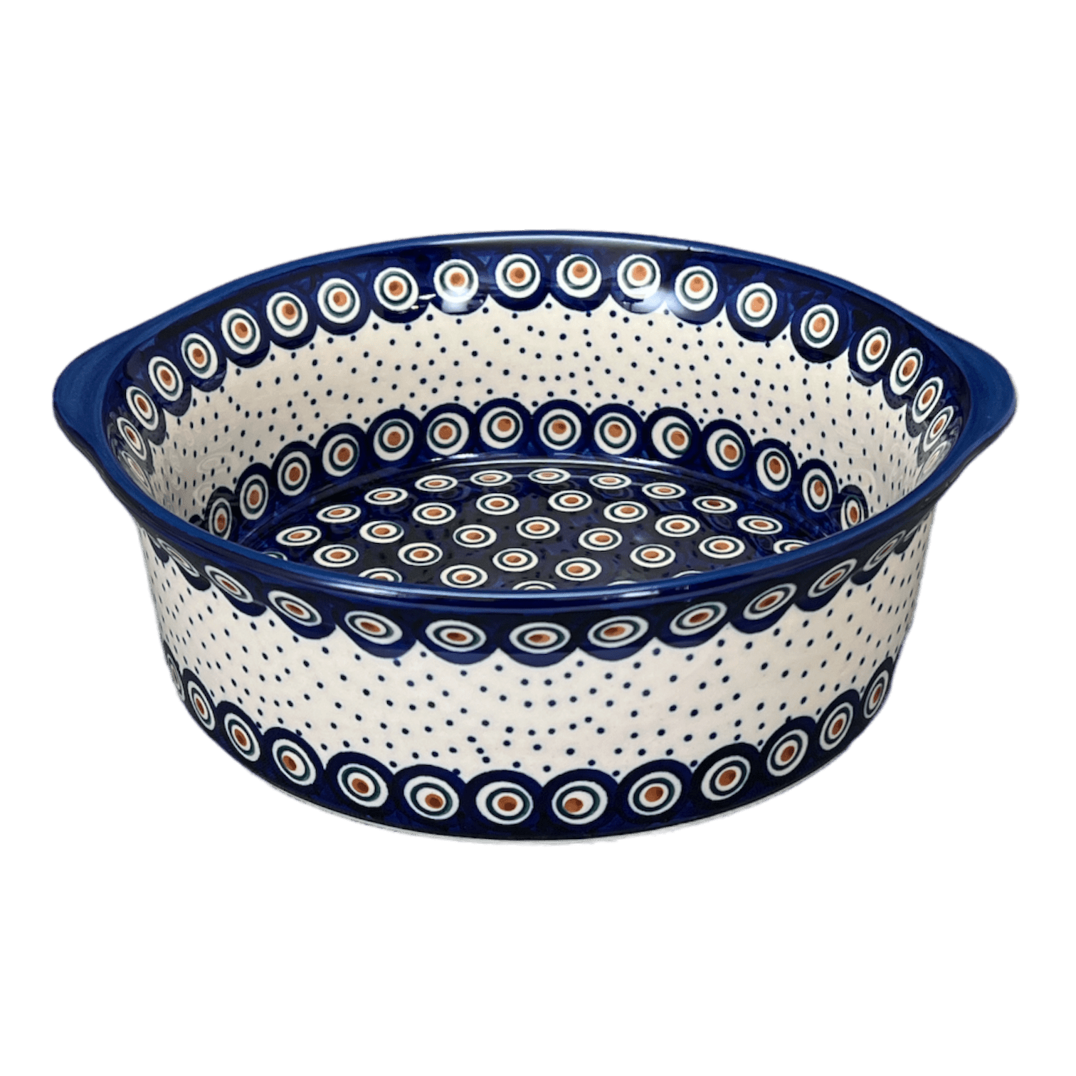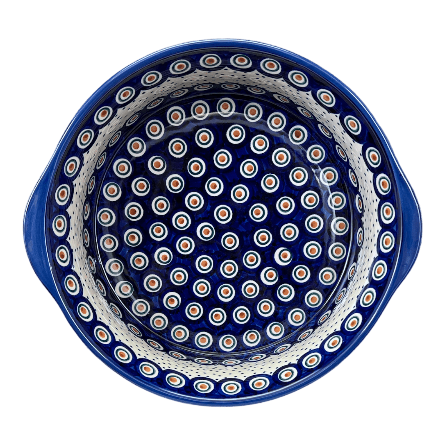Introducing the Polish Pottery 10" Deep Round Baker by Manufaktura in the mesmerizing "Peacock Dot" pattern! This stunning piece of kitchenware is not only functional but will also steal a special place in your heart. With its intricate design elements featuring majestic peacocks and playful dots, all beautifully hand-painted in predominantly blue tones with accents in white and brown, this baker is a true work of art.