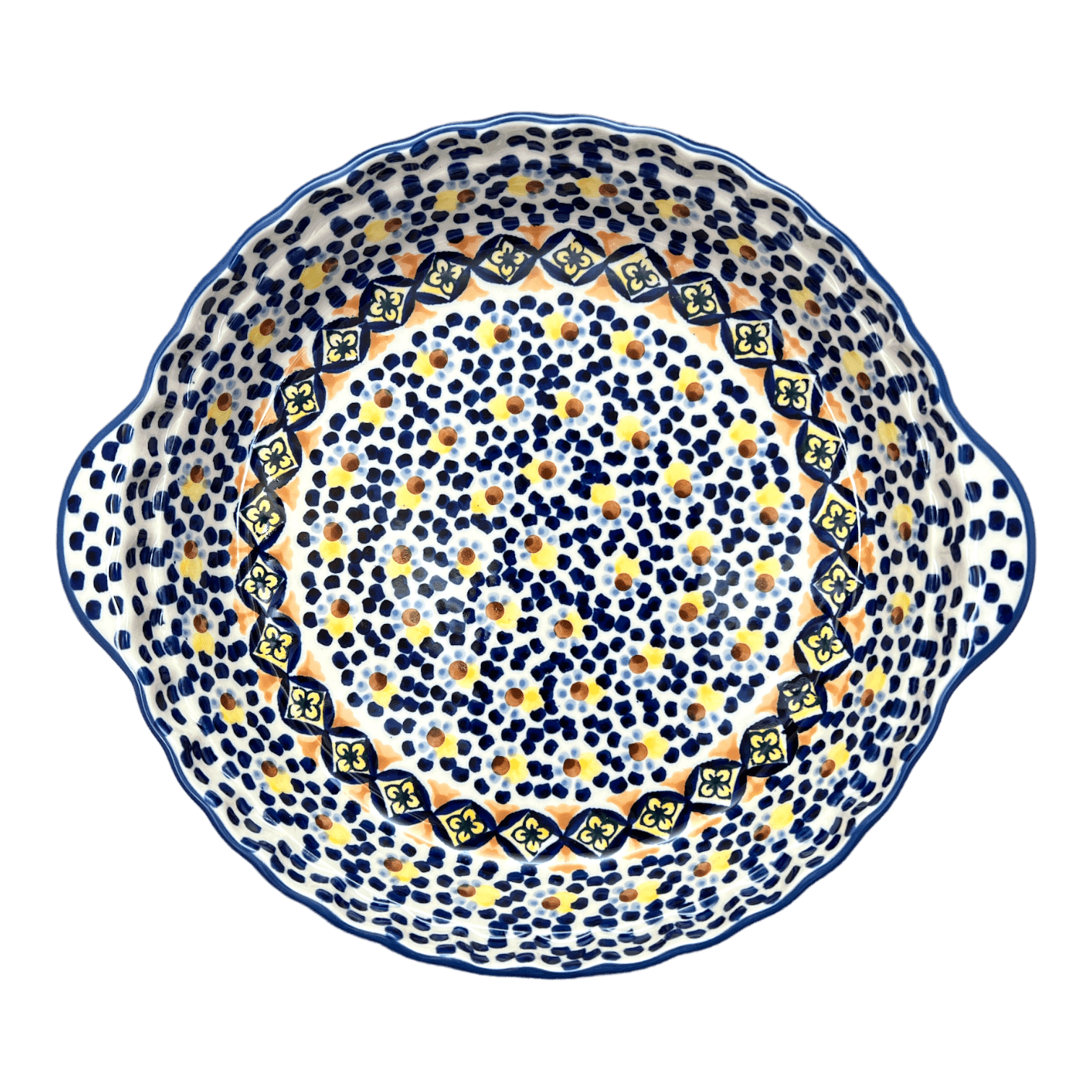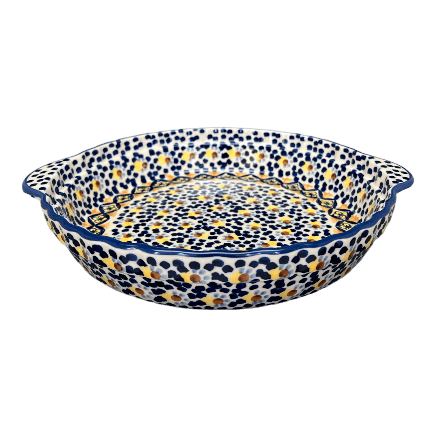 Introducing the ultimate pie plate that will revolutionize your baking experience - the Polish Pottery 9.75" Pie Plate with Handles by Manufaktura in the captivating "Kaleidoscope" pattern (ASR). Prepare to be amazed as this pie plate takes your culinary creations to a whole new level of deliciousness!