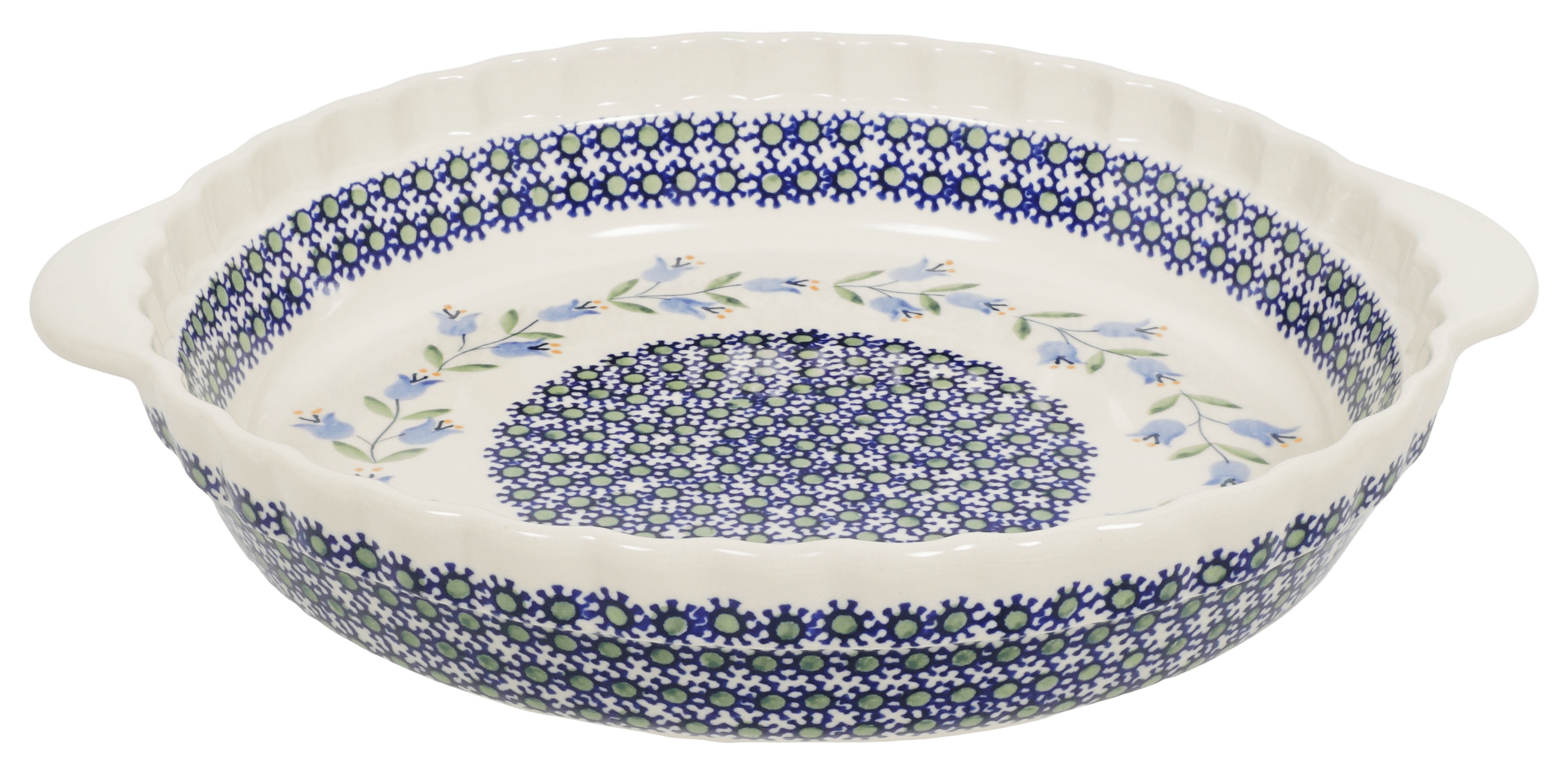 Introducing the Polish Pottery 9.75" Pie Plate with Handles by Manufaktura in the exquisite "Lily of the Valley" pattern! This pie plate is not just your ordinary baking dish - it's a game changer! Say goodbye to burnt crusts and uneven baking, because with this pie plate, you'll see the difference with your very first pie and love it to the last bite.
