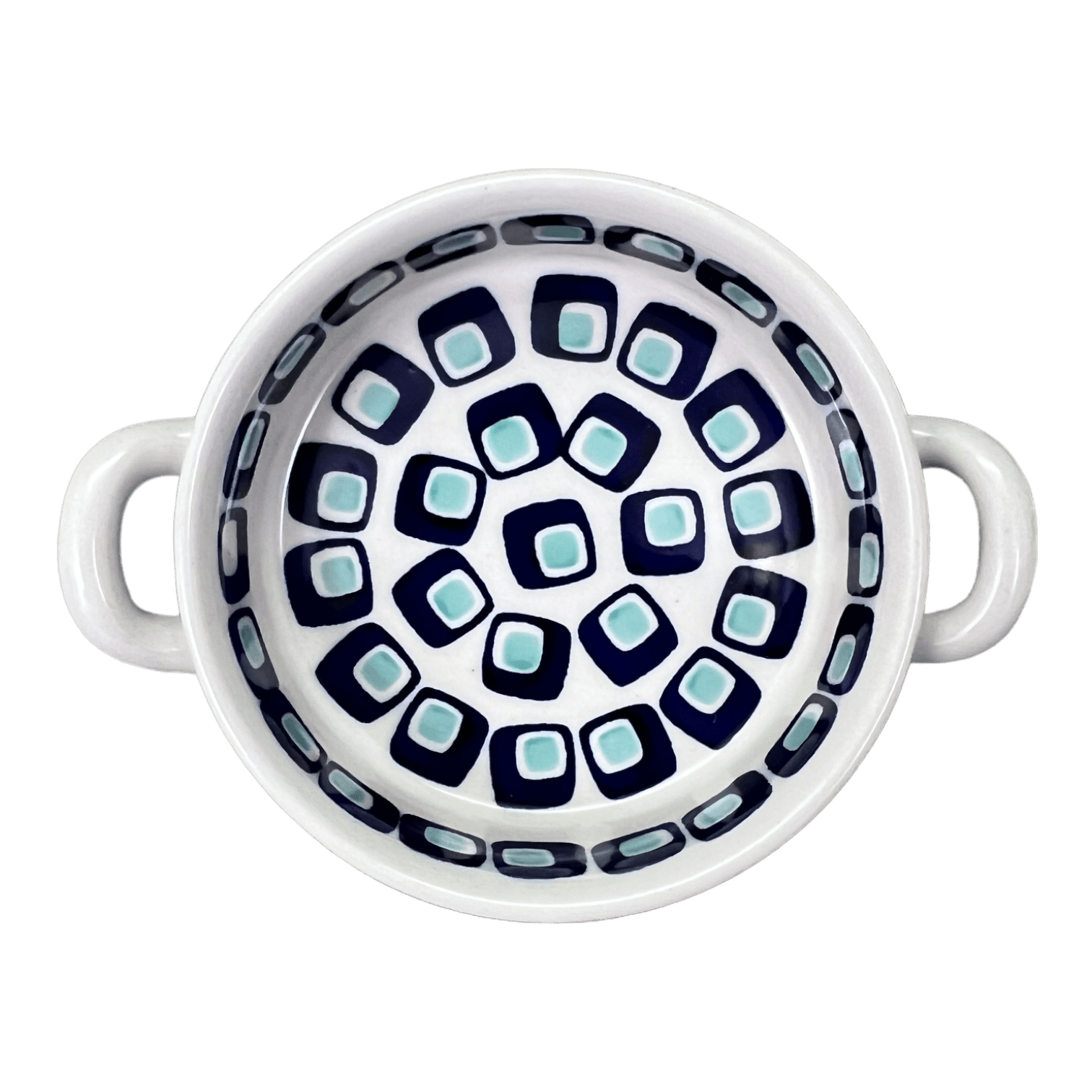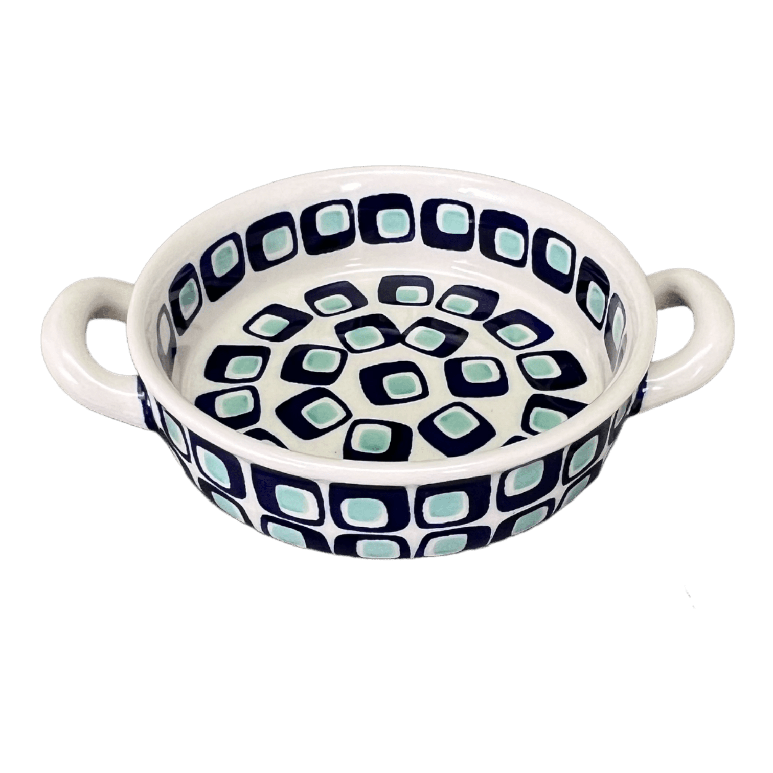 Are you looking for the perfect dish to serve your hot dips or individual desserts? Look no further than the Polish Pottery 5" Small Round Casserole with Handles by Manufaktura! Not only is this dish functional, but it is also absolutely beautiful. With its "Blue Retro" pattern, featuring a mix of geometric designs in blue, green, and white, it is sure to impress your guests.
