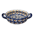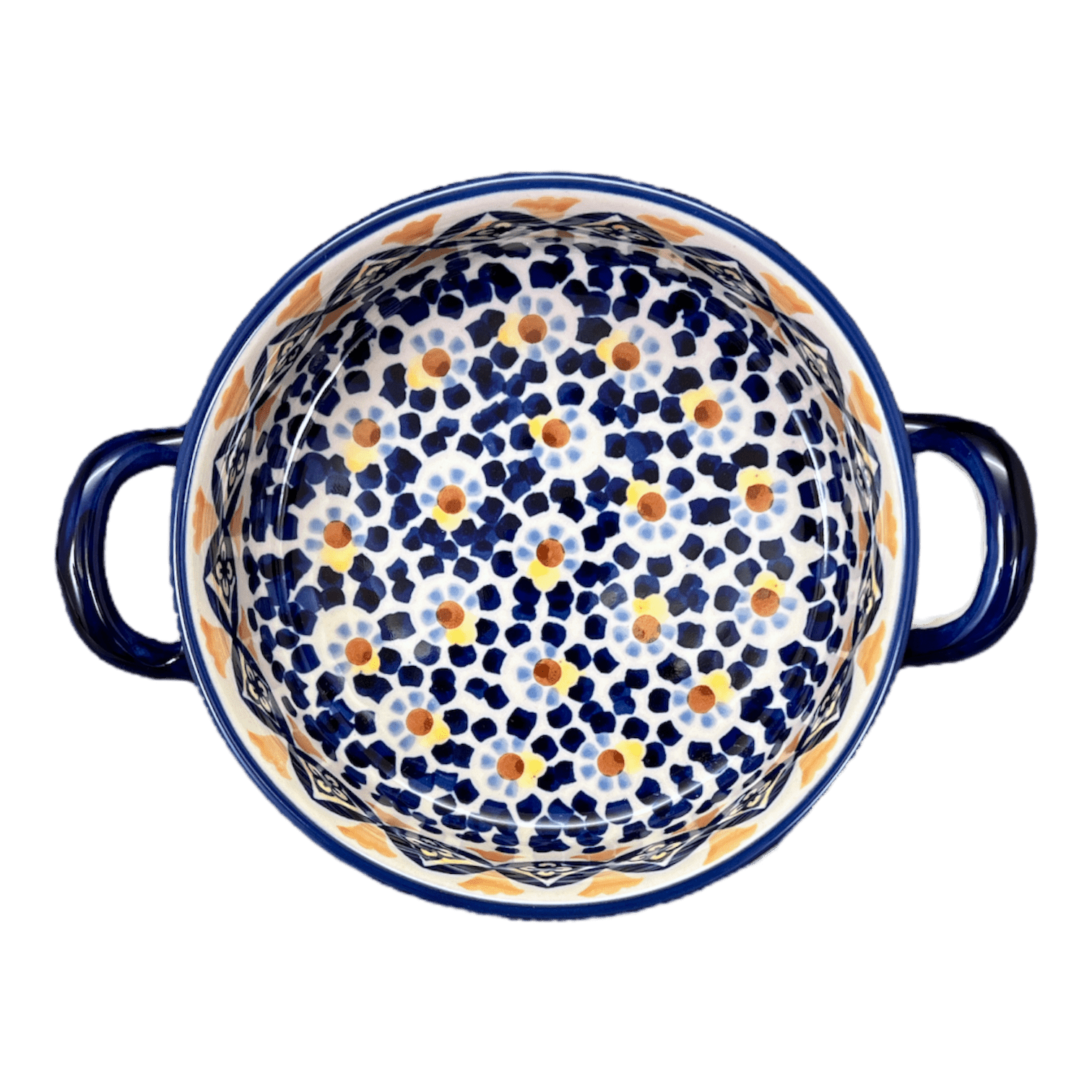 Introducing the Polish Pottery 5" Small Round Casserole W/Handles by Manufaktura in the captivating "Kaleidoscope" pattern (ASR). These adorable, round dishes are not just your average kitchenware - they are perfect for hot dips or individual desserts! Imagine serving up your favorite cheesy dip or a mouthwatering lava cake in these delightful little casseroles.
