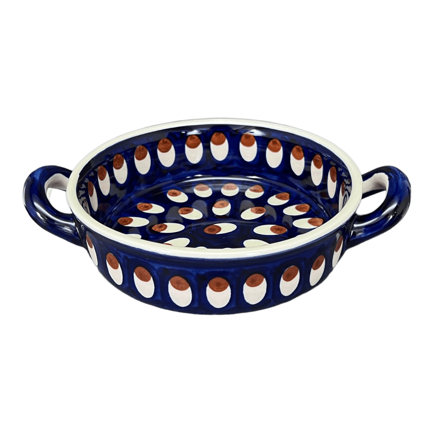 Introducing the Polish Pottery 5" Small Round Casserole W/Handles by Manufaktura in the captivating "Pheasant Feathers" pattern! These delightful little dishes are not only incredibly versatile, but they also bring a touch of whimsy and elegance to your dining experience. Whether you're serving up a steaming hot dip or a delectable individual dessert, these small round casseroles are the perfect size for any occasion.