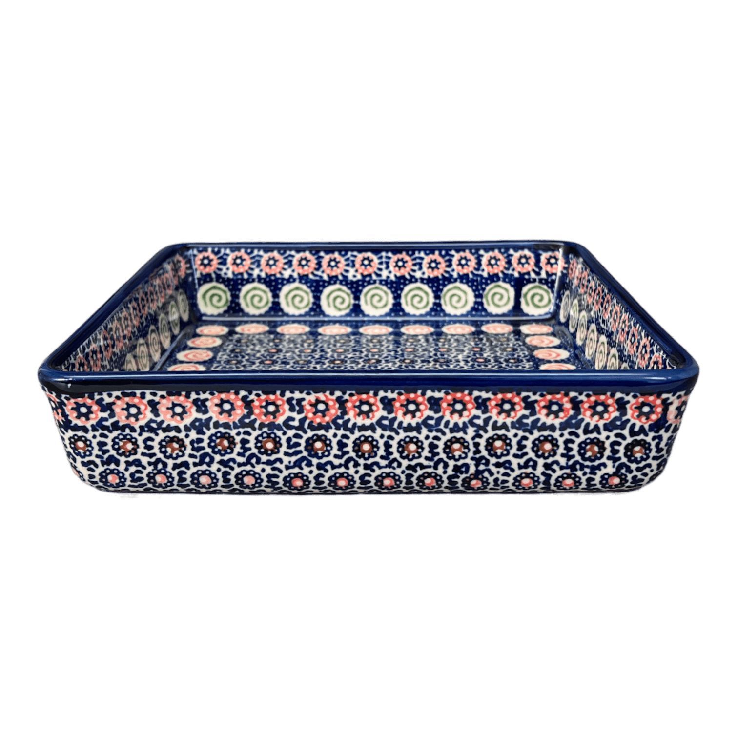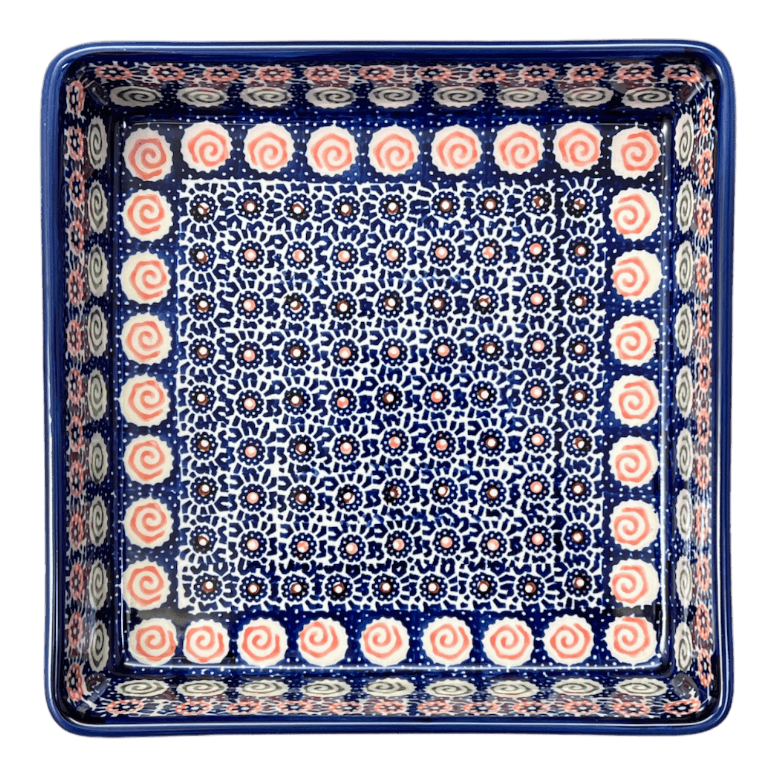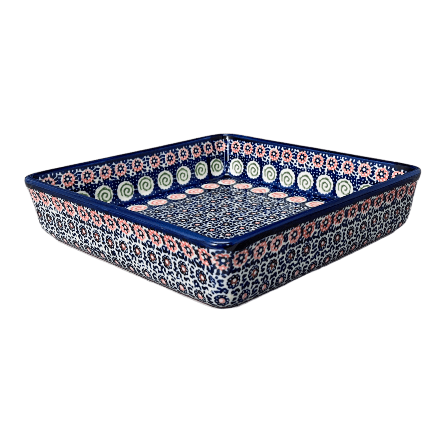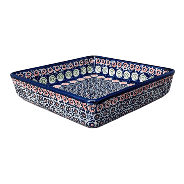 The "Carnival" pattern of this exquisite piece is categorized under Unikat designs, a term that translates to "Unique" in Polish. These designs elevate the craft to a higher form of artistry, showcasing more intricate details and a richer palette. Each Unikat item bears a special stamp on its base, signifying its authenticity and its maker's pride. This particular baker has been shaped and painted by the most skilled artisans of Manufaktura, a trailblazer in the Polish pottery market since 1992. With dimensions of 8.25" x 8.25" x 2", it is perfect for those delectable cakes and brownies, promising not just a feast for the taste buds but for the eyes as well.