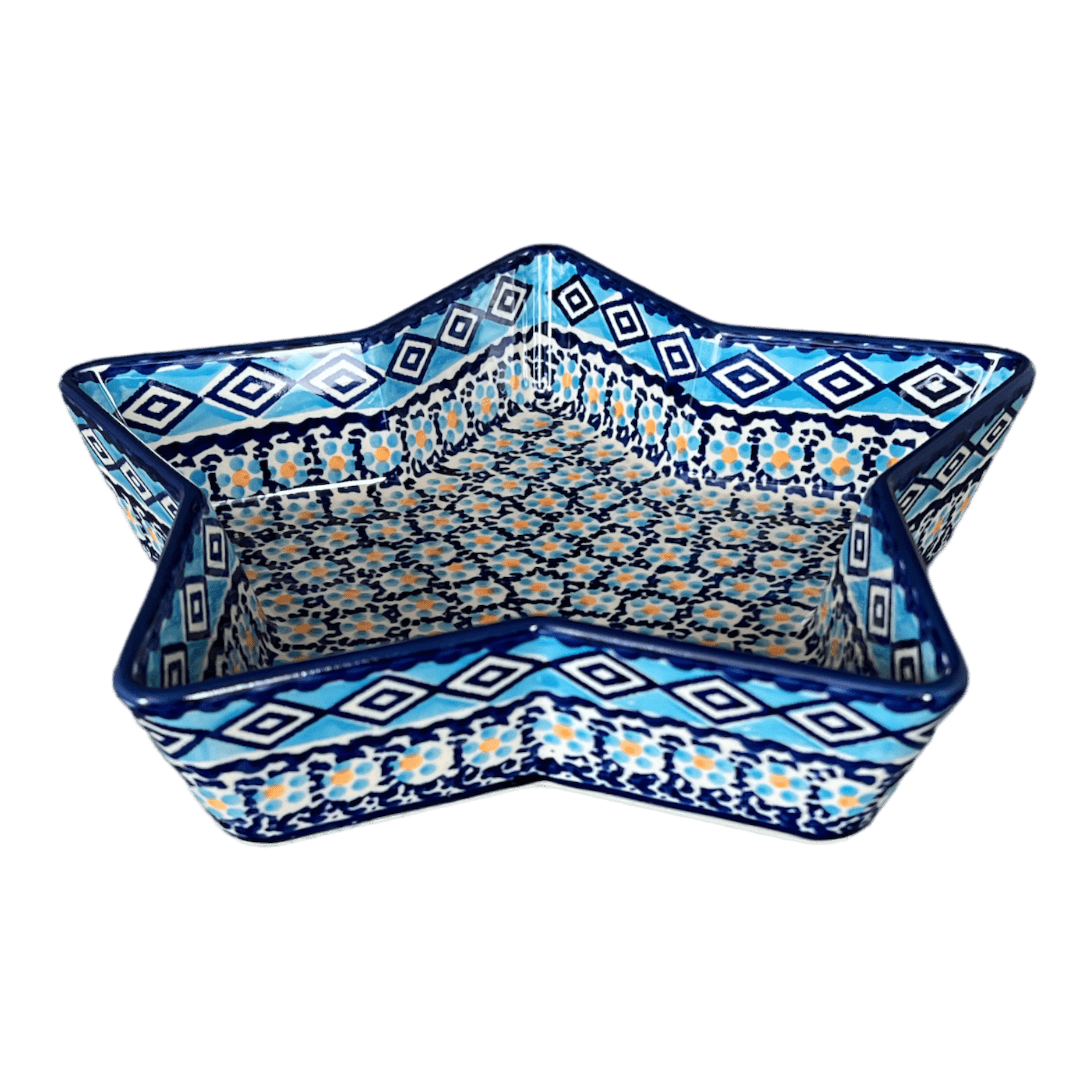 Imagine a centerpiece that captures the eye and elevates every meal to a celebration. Enter the Polish Pottery Baker, a star-shaped marvel crafted by the artisans of Manufaktura in the captivating "Blue Diamond" pattern. This 10-inch piece isn’t just a baking dish; it's a portal to a world of vibrant colors and intricate designs. The "Blue Diamond" pattern is a harmonious blend of geometric shapes and playful florals in soothing light blue, accented by bold dark blue and cheerful yellow. Each dish is a canvas where small, delicate flowers dance around the center, creating a visual feast that's as delightful as the dishes you'll serve in it!