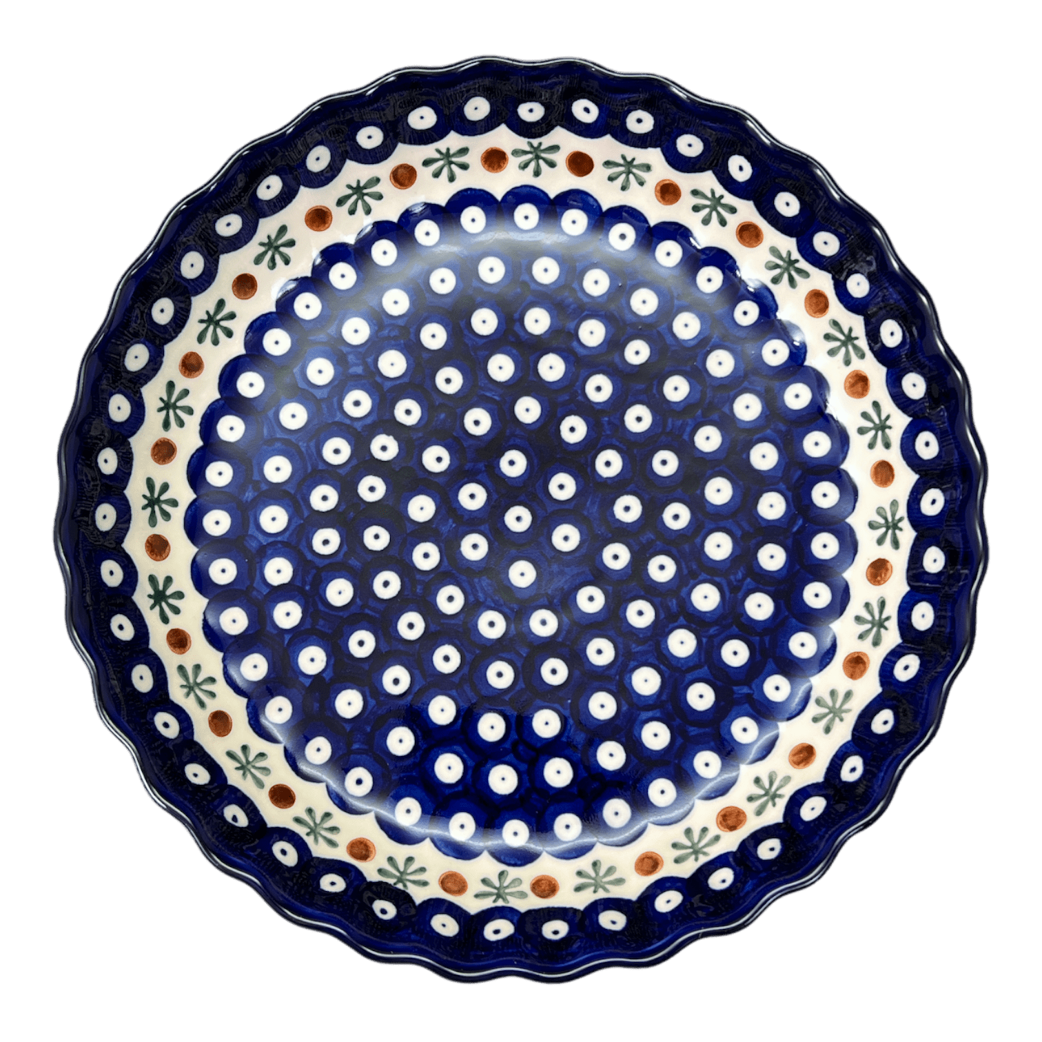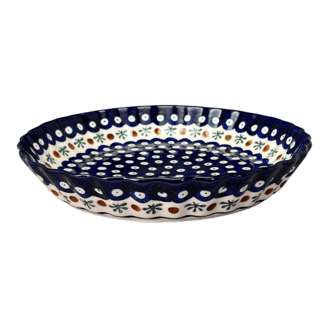 Imagine the charm of a rustic Polish kitchen infused with the craftsmanship of local artisans—this is the essence captured in the delightful "Mosquito" pattern of the Polish Pottery Pan by W.R. Ceramika. Crafted in the picturesque town of Boleslawiec, Poland, this 9.8" tart pan is more than just a baking vessel; it's a piece of art. Adorned with whimsical white polka dots set against a vibrant cobalt blue background, and accented by a unique band of brown dots interspersed with playful green "mosquitoes," this pan turns every baking experience into a joyful celebration. Whether it's a golden-brown quiche or a sweet, crumbly pie, your culinary creations will look as stunning as they taste!