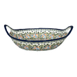 Imagine a masterpiece of color and craftsmanship gracing your dinner table – introducing the exquisite Polish Pottery Bowl by Zaklady, adorned in the enchanting "Floral Swallows" pattern. This capacious 15-inch round bowl, complete with practical handles, isn't just a serving piece but a conversation starter. Its vivid design showcases delightful swallows in flight, encircling a vibrant medley of orange, blue, and red flowers set against a serene light blue backdrop, punctuated with lively green and orange accents. This bowl is a true testament to the unique Unikat artistry, where each detail is painted with an expert's touch, ensuring no two pieces are exactly alike.