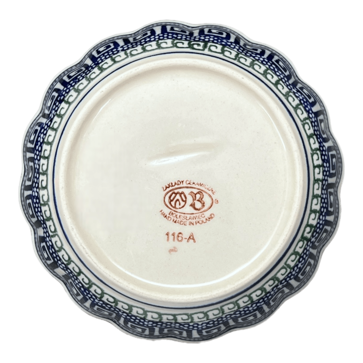 Imagine setting your table with a touch of timeless elegance and a sprinkle of charming folklore! The Polish Pottery Bowl from Zaklady, in the delightful "Grecian Dot" pattern, brings just that. This 6.25-inch round, scalloped beauty is not just a bowl, but a piece of art, meticulously hand-painted in Boleslawiec, Poland. The "Grecian Dot" design features classic white dots effervescently popping against a rich blue background, bordered by enchanting Grecian square swirls in harmonious shades of blue and green. This traditional pattern, crafted using the ancient "punching" technique, reflects a simpler yet profoundly artistic style, capturing the essence of nature and the skill of its creators.