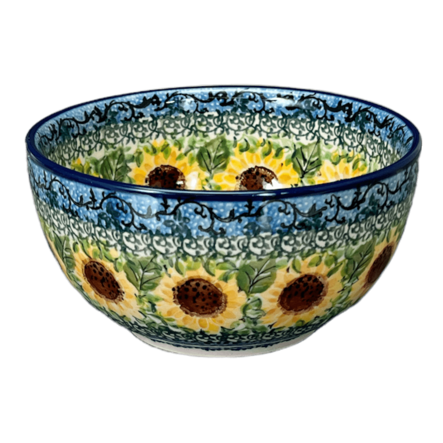 Introducing the Polish Pottery 5.5" Deep Bowl by Ceramika Artystyczna in the captivating "Sunflowers" pattern (U4739). These bowls are not just your ordinary dishes - they are perfect for soup, cereal, or even dessert! The "Sunflowers" pattern showcases a delightful blend of colors, with vibrant blue design elements adorned with pops of yellow and green.