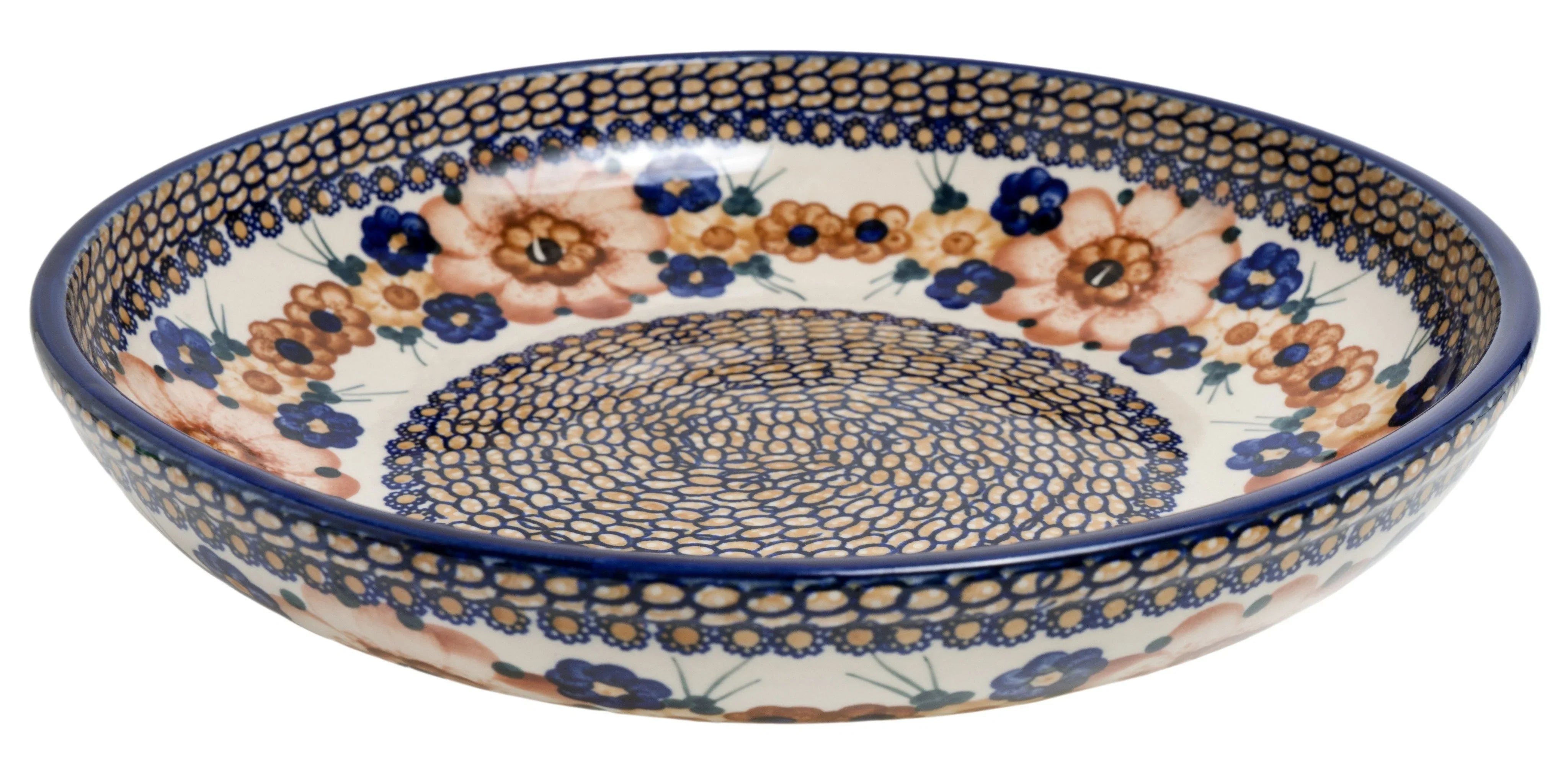 Imagine presenting your culinary creations in the enchanting Manufaktura Polish Pottery Bowl, a piece that is as visually stunning as it is functional. This 11.75" round, shallow salad bowl, featuring the exquisite "Bouquet in a Basket" pattern, transforms any table setting into a vibrant showcase of artistry. The intricate design, predominantly in brown with lively accents of blue, peach, and white, captures the essence of a blossoming garden. Each detail, from the orange center speckled with tiny white dots to the majestic, peach-colored flowers surrounded by smaller floral chains, tells a story of craftsmanship and tradition. This isn't just a bowl; it's a centerpiece that invites conversation and admiration.