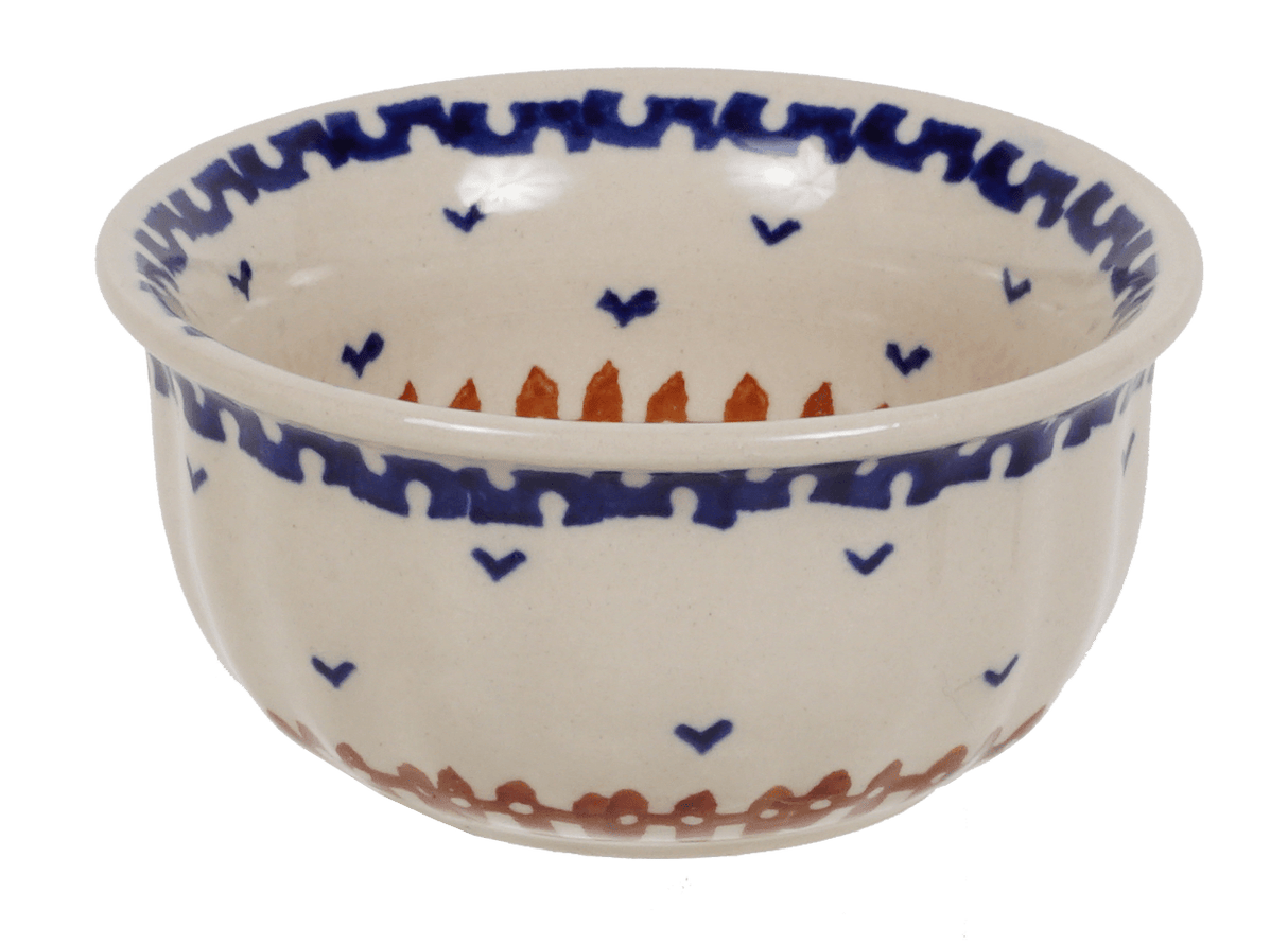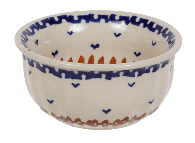 Introducing the enchanting Manufaktura Polish Pottery Bowl, a delightful addition to any home! Crafted with passion in the heart of Boleslawiec, Poland, this 3.5" round bowl dazzles in the "American Dream" pattern, a design that captivates the eye with its intricate floral and fence motifs. Each bowl is a canvas, featuring a serene blue background dotted with delicate white specks, encircled by vibrant green grass, charming tiny orange flowers, and a quaint brown fence. This traditional piece is adorned with small blue circumflexes that sprinkle joy across the surface, making it not just a bowl, but a masterpiece of home decor.