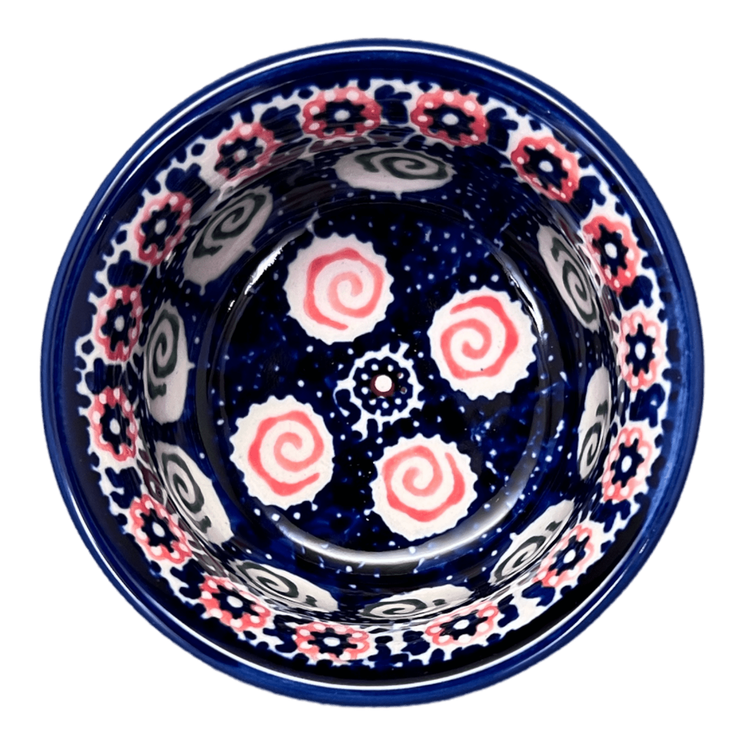 Imagine small blue and orange blossoms dancing against a mesmerizing white and blue background at the center of the bowl. Surrounding this charming display, a band of orange spirals inside white circles adds a touch of whimsy. And if that wasn't enough, a band of green spirals inside white circles completes the picture-perfect design. This pattern is so unique and captivating that it has earned the prestigious title of Unikat level of artistry.