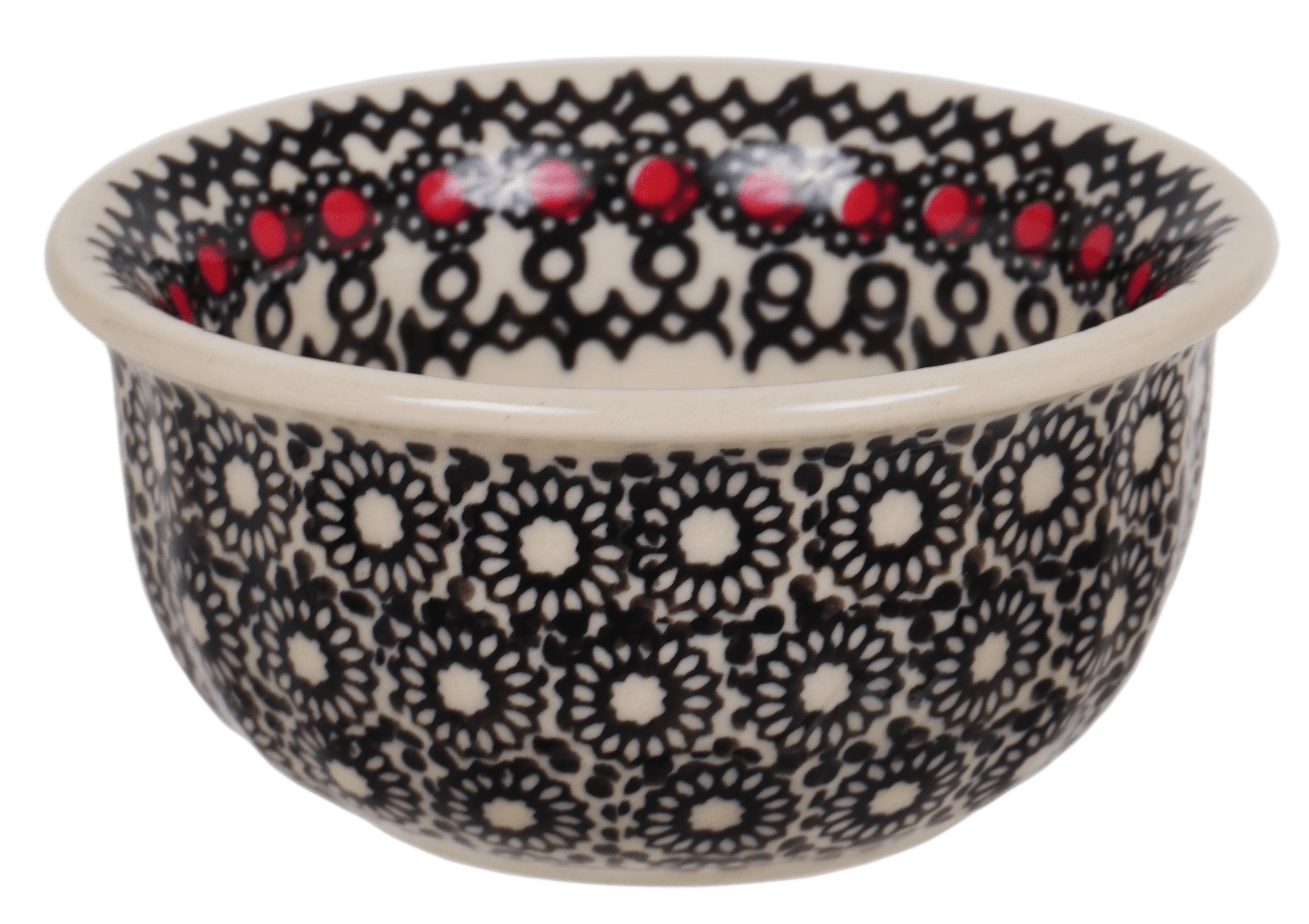 Introducing the Polish Pottery 3.5" Bowl by Manufaktura in the captivating "Duet in Black & Red" pattern (DPCC). This little bowl is not just your average ramekin or dipping bowl, it is a piece of art that will bring a pop of color and elegance to your table. The "Duet in Black & Red" pattern is a mesmerizing combination of black flowers with striking accents in red and white, set against a pristine white background. It's like a beautiful symphony of colors that will make your heart skip a beat!