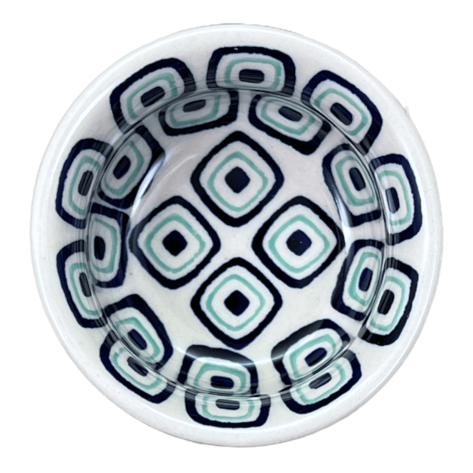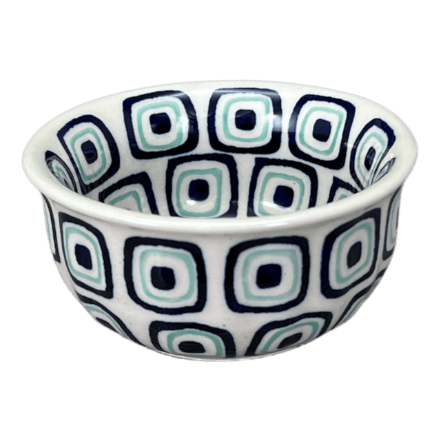 Introducing the stunning Polish Pottery 3.5" Bowl by Manufaktura in the captivating "Green Retro" pattern (604A). This bowl is not just your ordinary kitchen accessory - it is a work of art! The Green Retro pattern showcases a mesmerizing combination of geometric shapes in a predominantly green hue, with delicate accents in white and blue. It's a design that will truly make a statement in your home.
