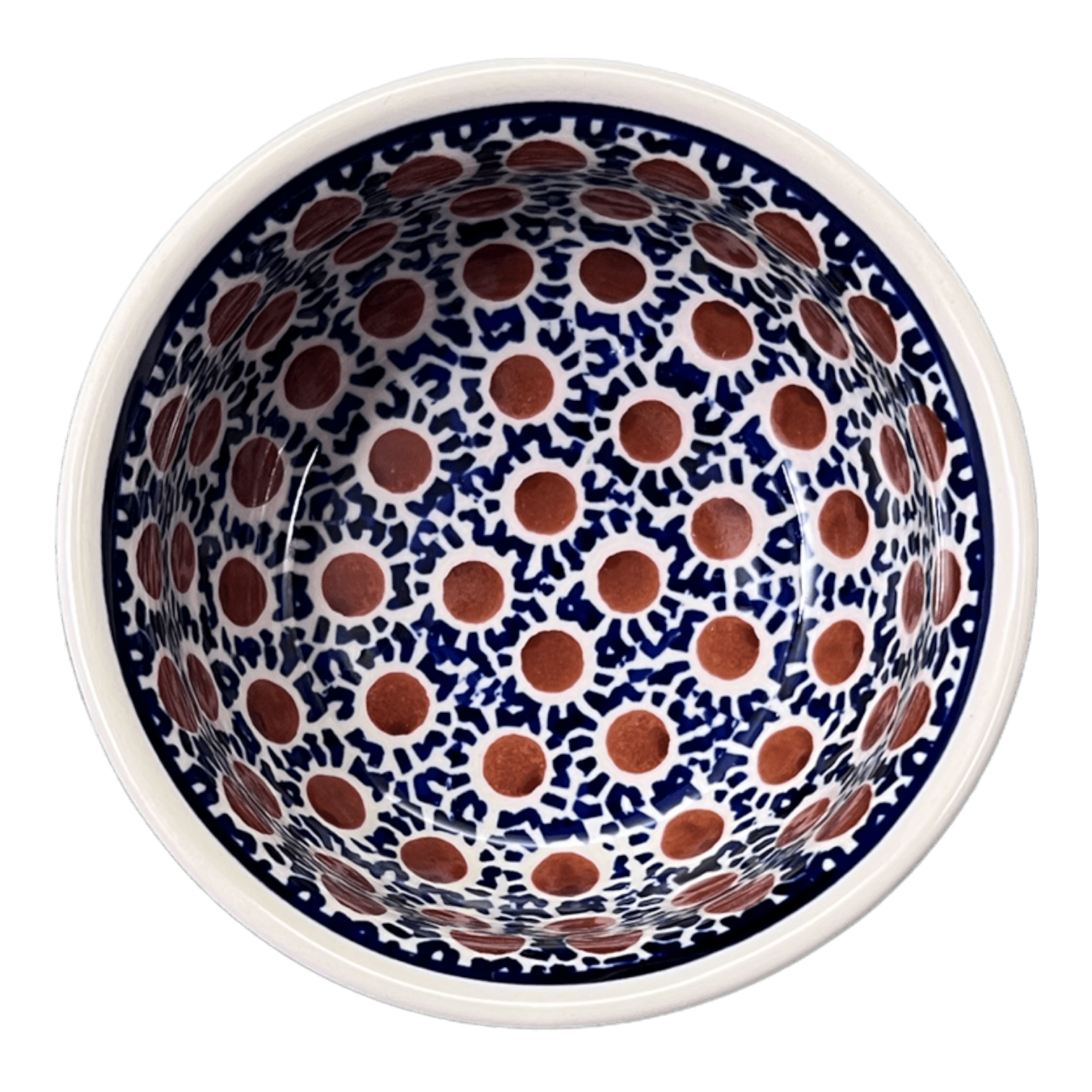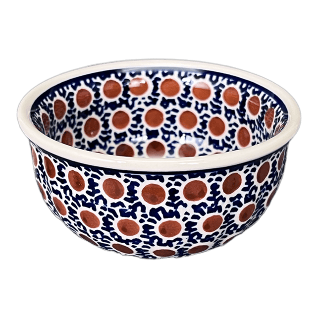 Introducing the Polish Pottery 4.5" Bowl by Manufaktura in the captivating "Chocolate Drop" pattern. This bowl is not just your ordinary bowl - it's perfect for all your dips and condiments! The "Chocolate Drop" pattern features a mesmerizing blend of geometric designs in a predominantly Blue color, with delightful accents in Brown and White. It's like having a work of art right in your kitchen!