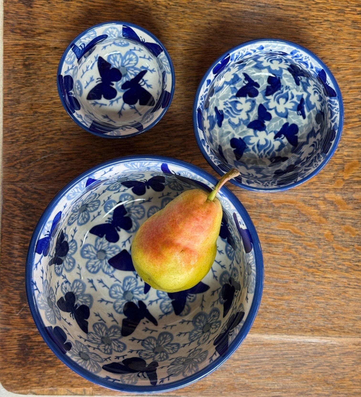 Handcrafted in Boleslawiec, Poland, by skilled artisans, this Polish Pottery bowl is a testament to the rich heritage and craftsmanship of the region. Each brushstroke and intricate detail on the "Dusty Blue Butterflies" pattern is lovingly painted by these talented individuals, making each piece truly unique.