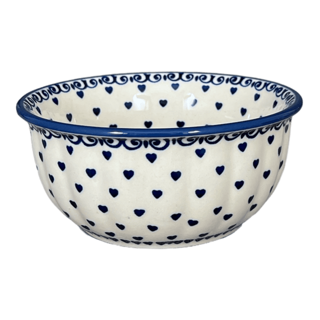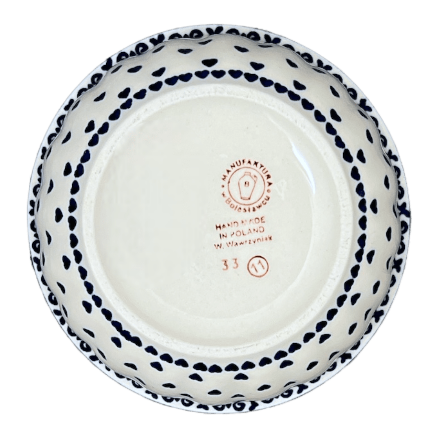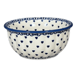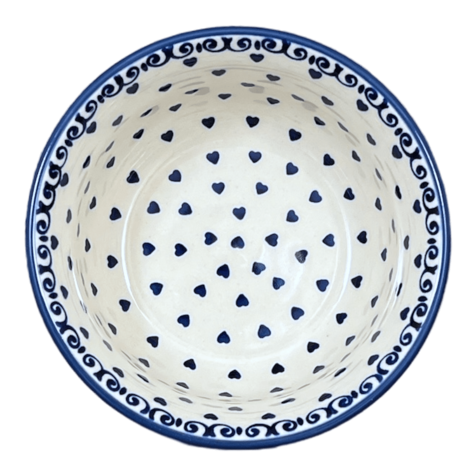 Introducing the enchanting "Heartfelt Blue" Polish Pottery Bowl from Manufaktura, a piece that turns everyday dining into a charming celebration. This delightful 5.5" bowl, crafted in the historic town of Boleslawiec, Poland, is perfect for cradling everything from your morning cereal to that late-night ice cream treat. The lovely "Heartfelt Blue" pattern is a dance of cobalt blue hearts swirling around a pristine white backdrop, each hand-stamped using traditional techniques by skilled artisans. It's more than just a bowl; it's a little piece of art that fits right into your hands.
