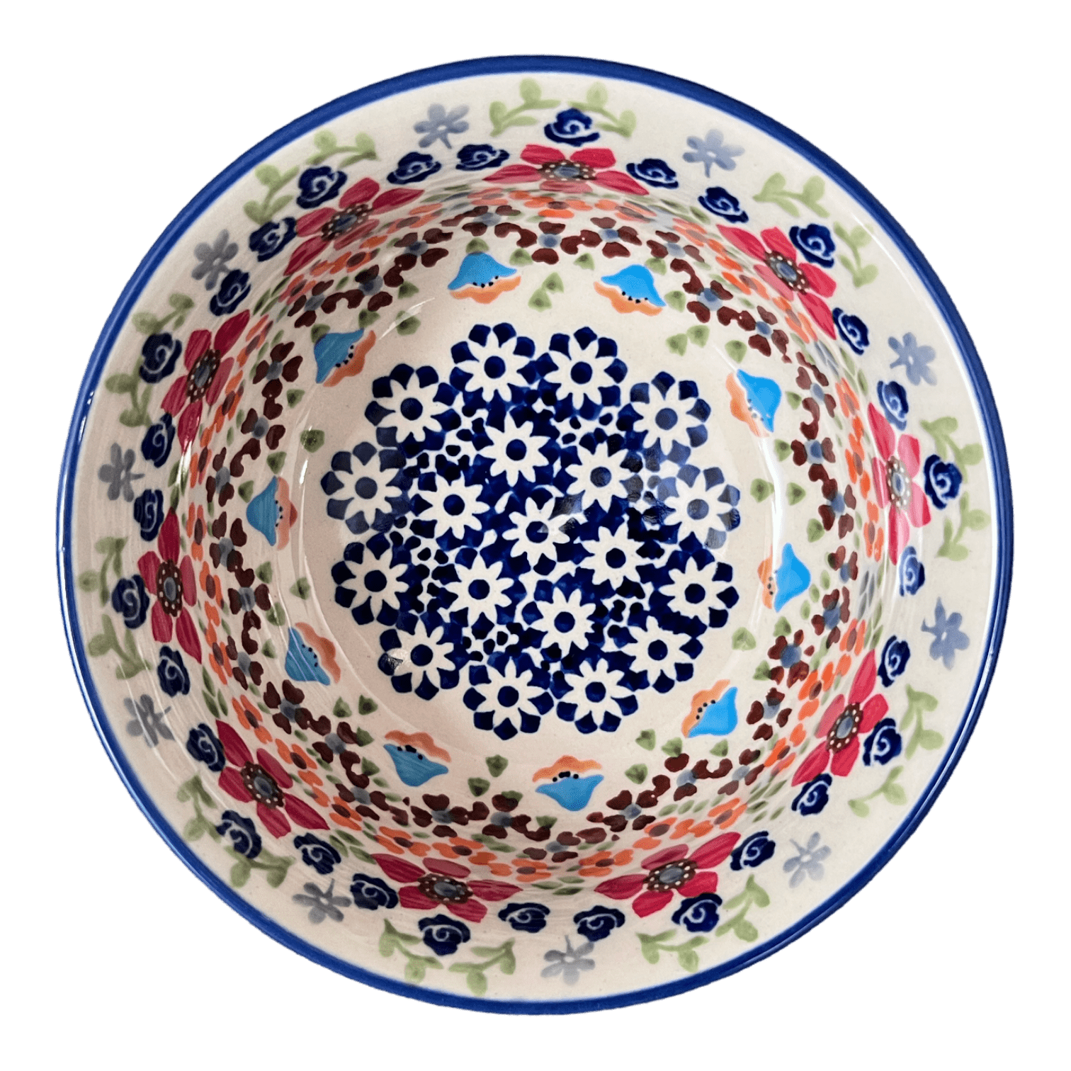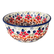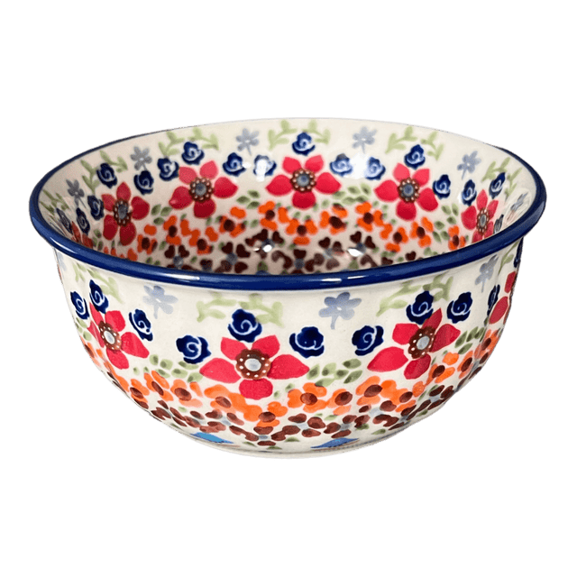 Immerse yourself in the enchanting world of Polish pottery with this exquisite 5.5" bowl from Manufaktura, showcasing the captivating "Stellar Celebration" pattern. This piece isn't just a bowl; it's a vibrant canvas painted with a bouquet of colors and intricate designs. Imagine scooping a spoonful of your favorite ice cream or diving into a hearty soup, surrounded by a dance of flowers in reds, oranges, and browns, accented by touches of green. Central to this artistic explosion are charming white flowers set against a serene blue background, with layers of tiny brown, orange, red, and blue blossoms spiraling outwards, culminating in delicate cadet gray flowers. It's not just dinnerware; it's a piece of art that turns every meal into a celebration.