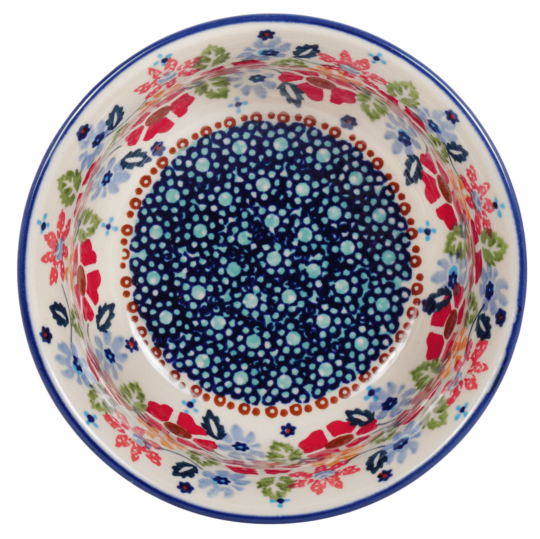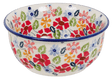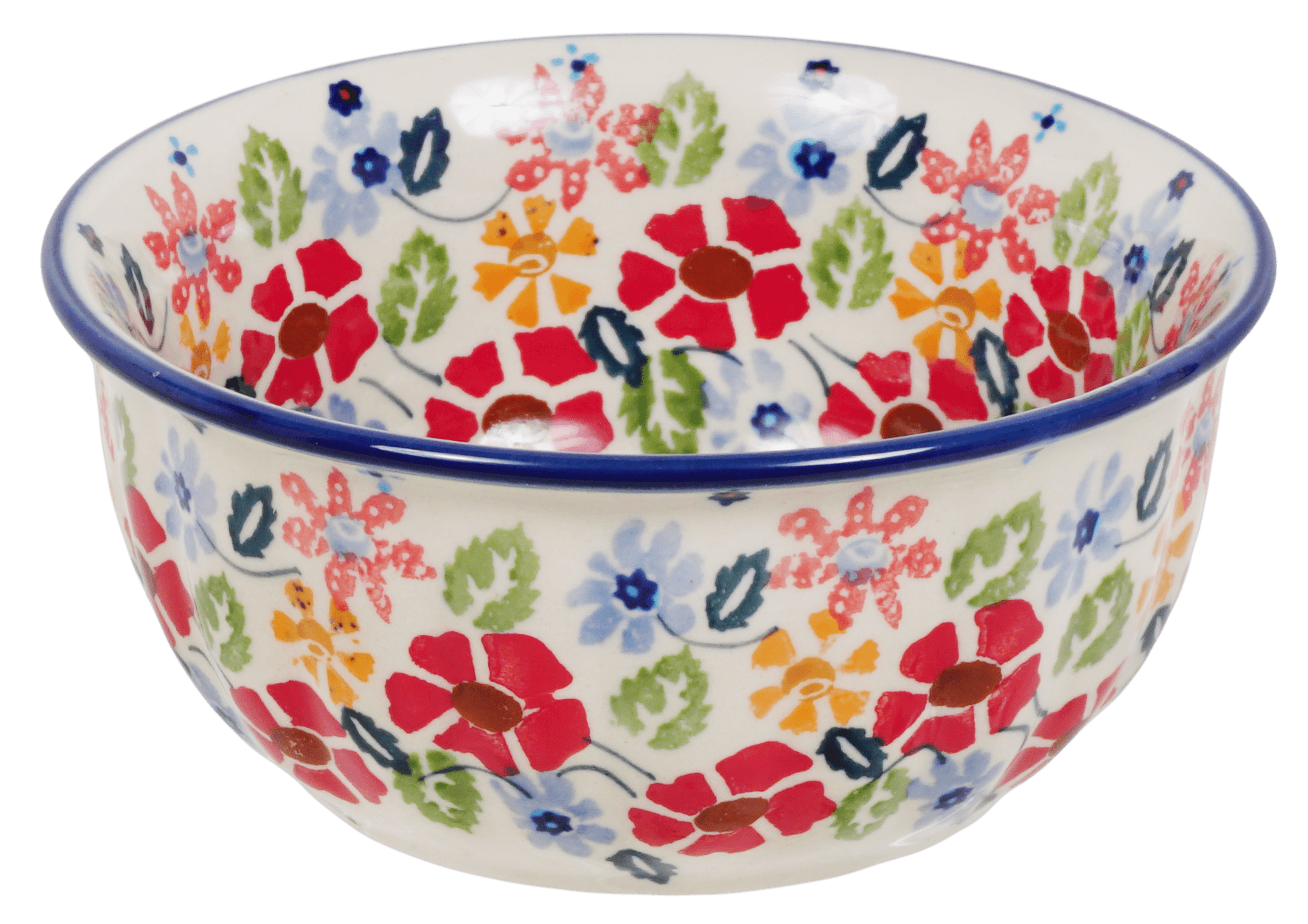 Imagine a table adorned with a masterpiece, not just any dish, but the Polish Pottery Bowl from Manufaktura, an emblem of craftsmanship and beauty. This charming 5.5" bowl, crafted in the heart of Boleslawiec, Poland, is a canvas featuring the "Brilliant Bouquet" pattern. Picture yourself indulging in a warm soup or a refreshing salad from this bowl, where each spoonful is complemented by a view of meticulously painted red, blue, orange, and green floral designs. The central motif of densely clustered small blue flowers is surrounded by a festival of large red blossoms, faded pink, and blue flowers, all set against a crisp white background. This bowl isn’t just a dish; it's a celebration of art!
