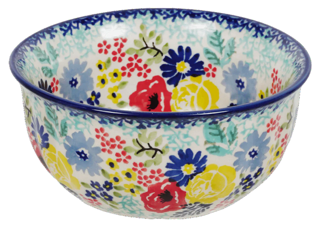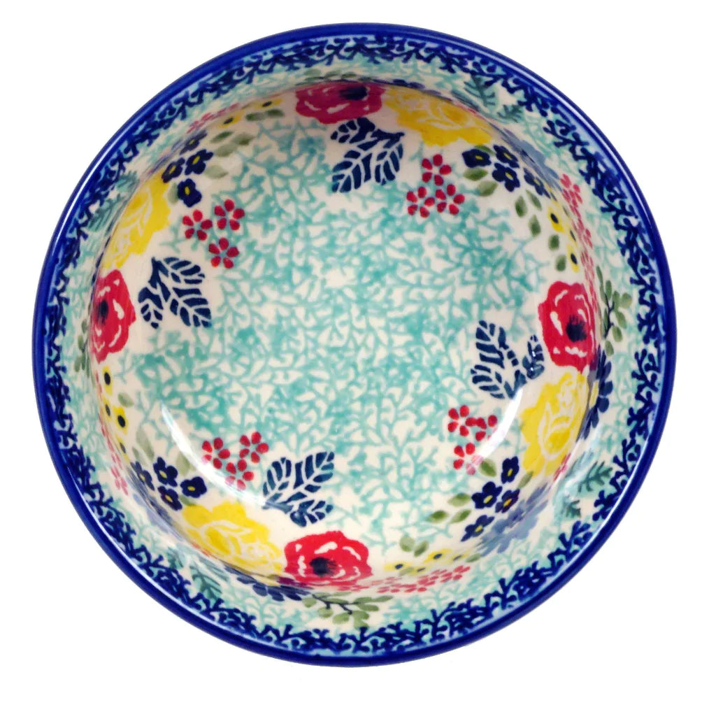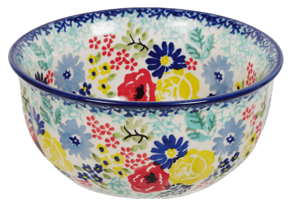 Step into the enchanting world of the "Garden Party" with this delightful 5.5" Polish Pottery Bowl by Manufaktura, a treasure that brings the vibrancy of a blooming garden right to your table! Picture yourself enjoying a hearty soup, a refreshing salad, or a delectable dessert from a bowl that's not just a dish but a piece of art. Adorned with a kaleidoscope of red, yellow, and blue flowers encircling a center of light turquoise vines against a pristine white background, this bowl turns every meal into a festive celebration.