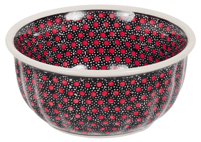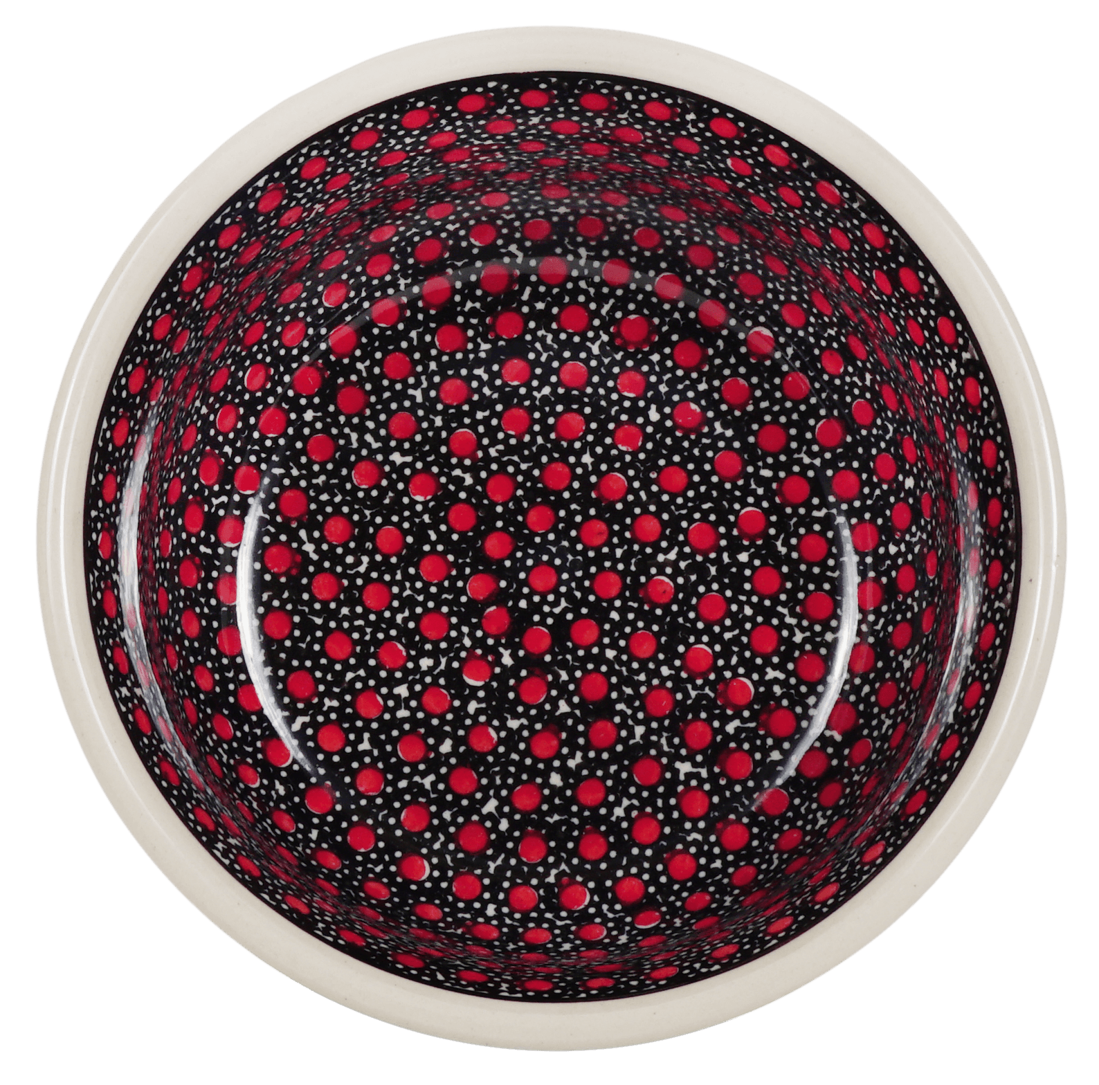Immerse yourself in the vibrant elegance of the Manufaktura Polish Pottery Bowl, a masterpiece crafted in the heart of Boleslawiec, Poland. This 5.5" round bowl, adorned with the mesmerizing "Scarlet Night" pattern, transforms every meal into a festive occasion. Whether it's a steamy bowl of soup, a refreshing side salad, or your favorite ice cream scoop, this bowl brings a burst of color and sophistication to your dining experience. The striking "Scarlet Night" design features a dramatic black backdrop sprinkled with tiny white dots, while small red circles create captivating bands around the center, inviting everyone to a visual feast.