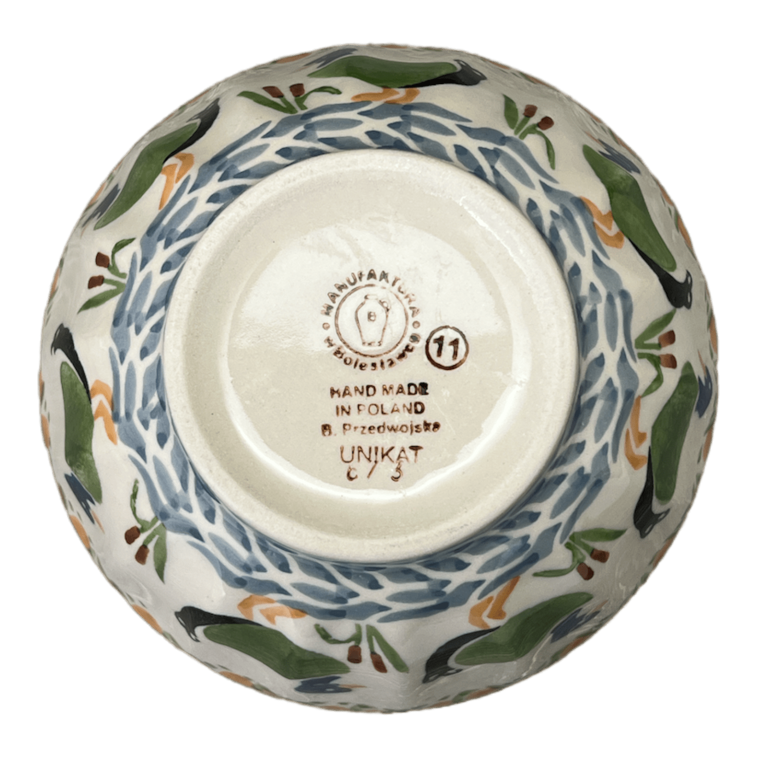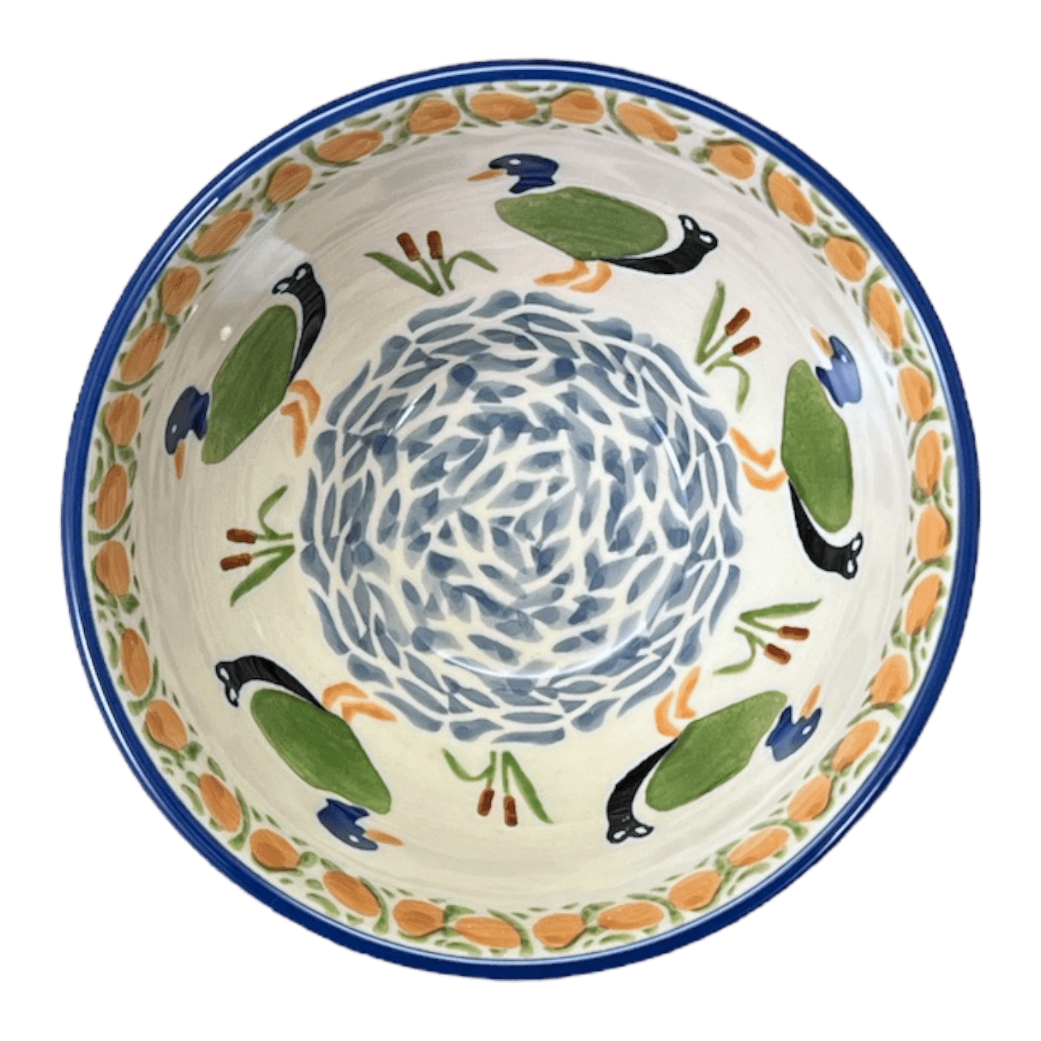 Introducing the enchanting Manufaktura Polish Pottery Bowl, a piece that transcends the ordinary to bring a touch of whimsical elegance to your dining table. Crafted in the heart of Boleslawiec, Poland, this bowl is not just a dish, but a portal to a world of artistic heritage. With its 5.5-inch diameter and standing 3 inches tall, this delightful piece is perfect for serving everything from a hearty soup to your favorite ice cream. The "Ducks in a Row" pattern features an adorable parade of large green ducks with striking blue heads, meticulously painted against a serene white background with a light blue weave at the center. This design is not only charming but also a testament to the unique artistry of the Unikat level, showcasing intricate details and a vibrant mix of colors.