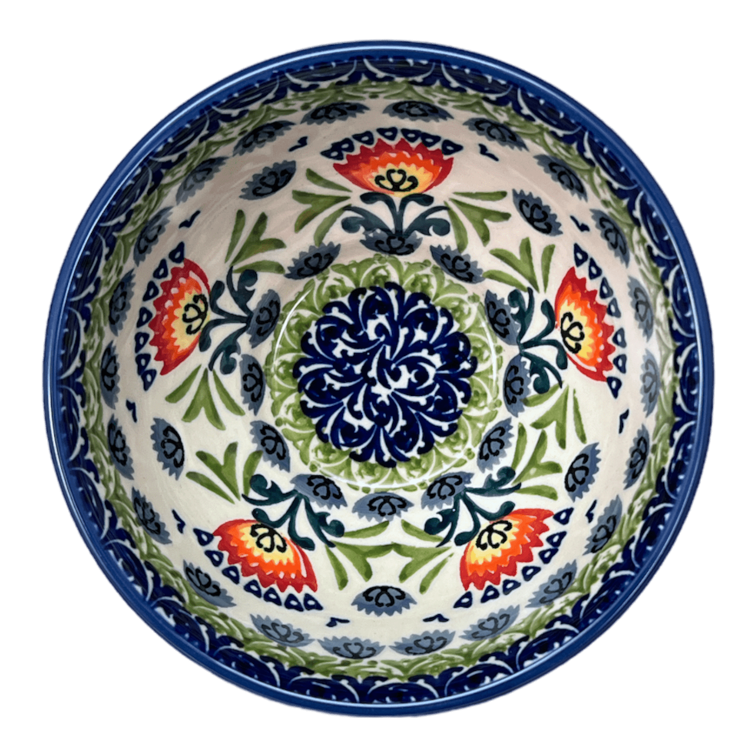 The "Floral Fans" pattern itself is a festival of colors and artistry, featuring a pristine white background with vibrant blue floral motifs that dance around a central band of green. Red, orange, and yellow blooms with teal blue stems add a burst of color, while green petals and cadet gray blossoms fill the spaces in between. Each bowl not only serves a practical purpose but also tells a story of heritage and exceptional artistry, with every element hand-painted with meticulous attention to detail. These bowls carry the "UNIKAT" stamp, signifying that they are limited edition pieces, crafted by artists who have reached the pinnacle of their craft, making them not just dishes but collectibles.