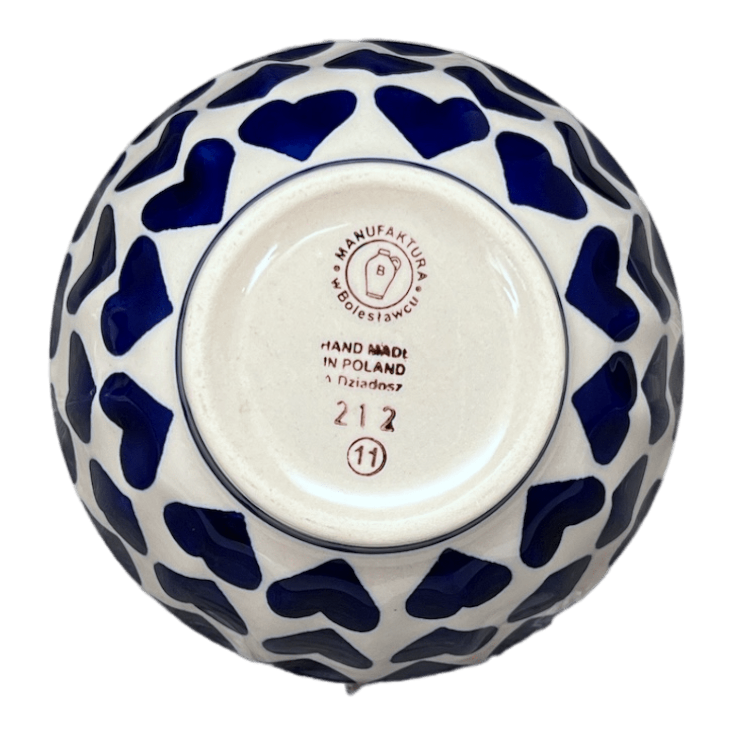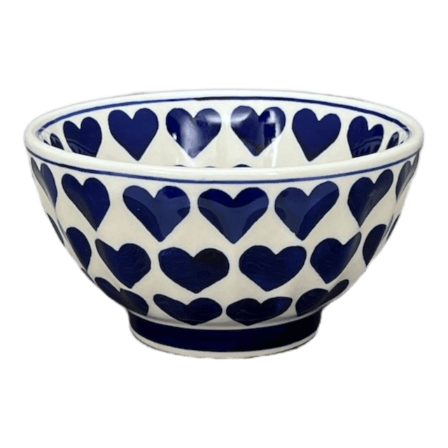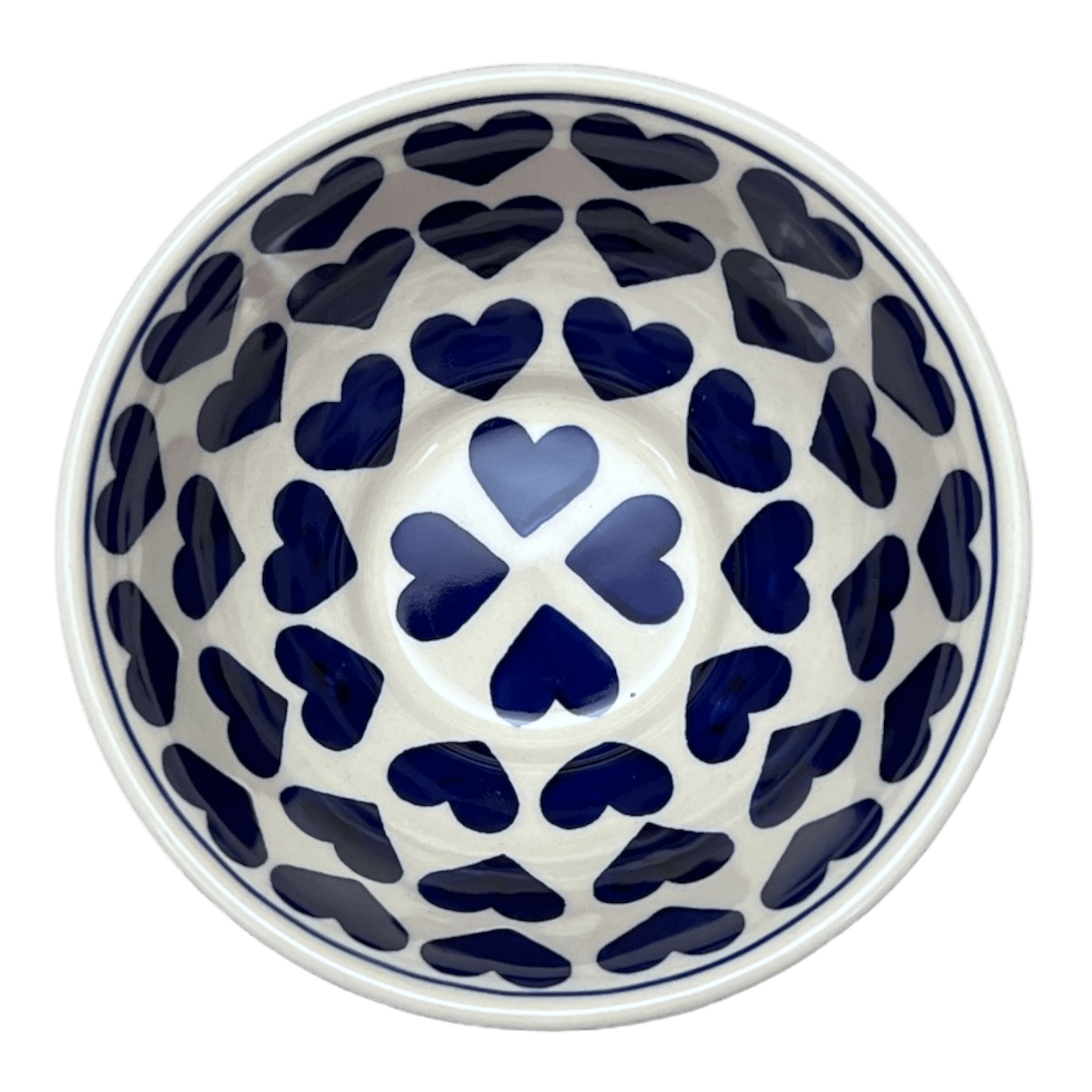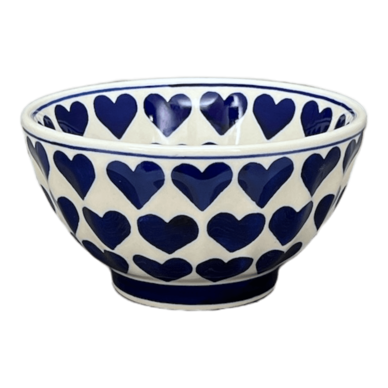 Imagine a bowl that not only serves your favorite creamy soup or crispy cereal but also adds a dash of artistic flair to your dining table! Introducing the Polish Pottery Bowl from Manufaktura, crafted in the enchanting "Whole Hearted" pattern. With a playful arrangement of blue hearts dancing over a pristine white background, this bowl is a testament to the joyous spirit of traditional Polish craftsmanship. Each 5.5-inch round bowl sits elegantly atop a narrow pedestal, making it a standout addition whether it's part of a lavish dinner party or a cozy meal at home.