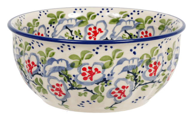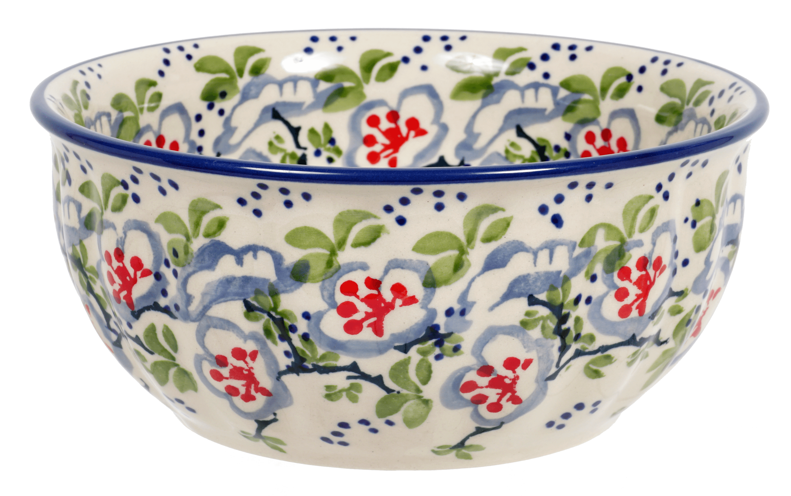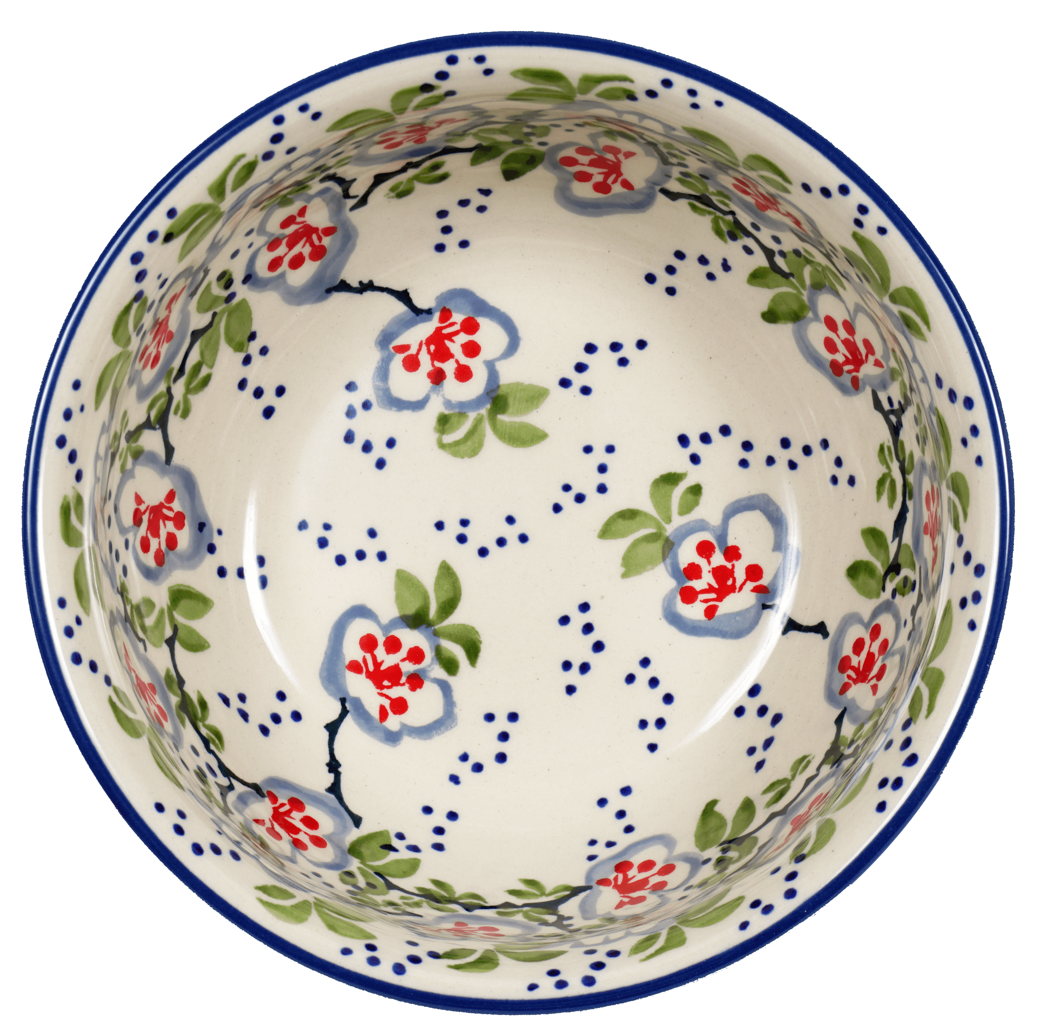 What sets this bowl apart is its designation as a Unikat piece, a term that translates to 'Unique' from Polish. Unikat pieces represent a higher tier of craftsmanship and complexity in design. As the artists at Manufaktura grow in their craft, they graduate to creating these intricate, multi-colored designs that require a meticulous hand and a keen eye for detail. This particular "Flowers & Lace" pattern is a testament to this elevated artistry, featuring larger floral elements intertwined with teal vines and tiny clusters of blue dots that fill the spaces with whimsy. Each Unikat item bears a special stamp on its base, signaling its authenticity and uniqueness, making it not just a dining vessel but a collector's delight.