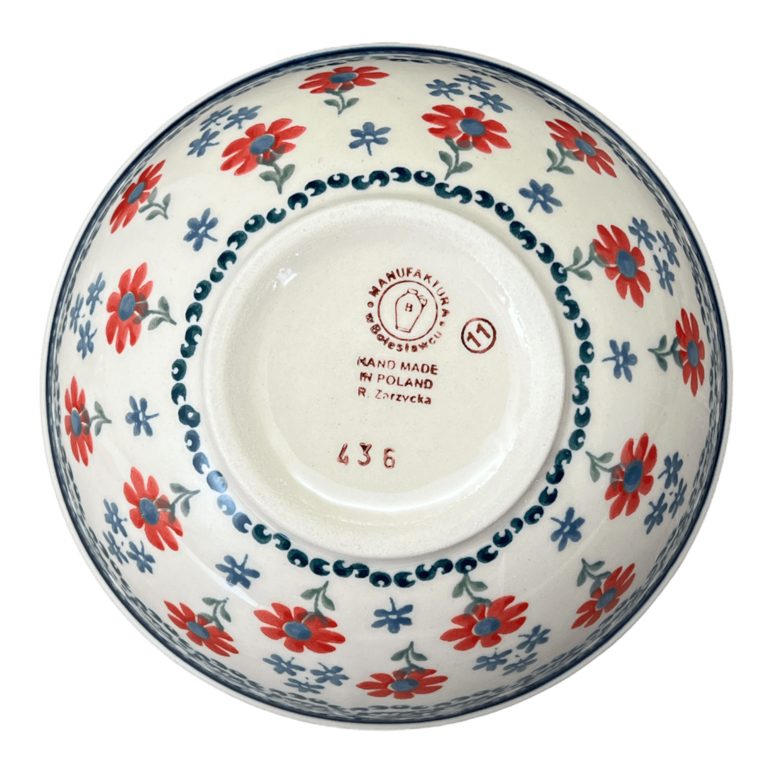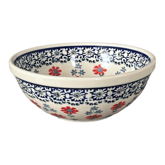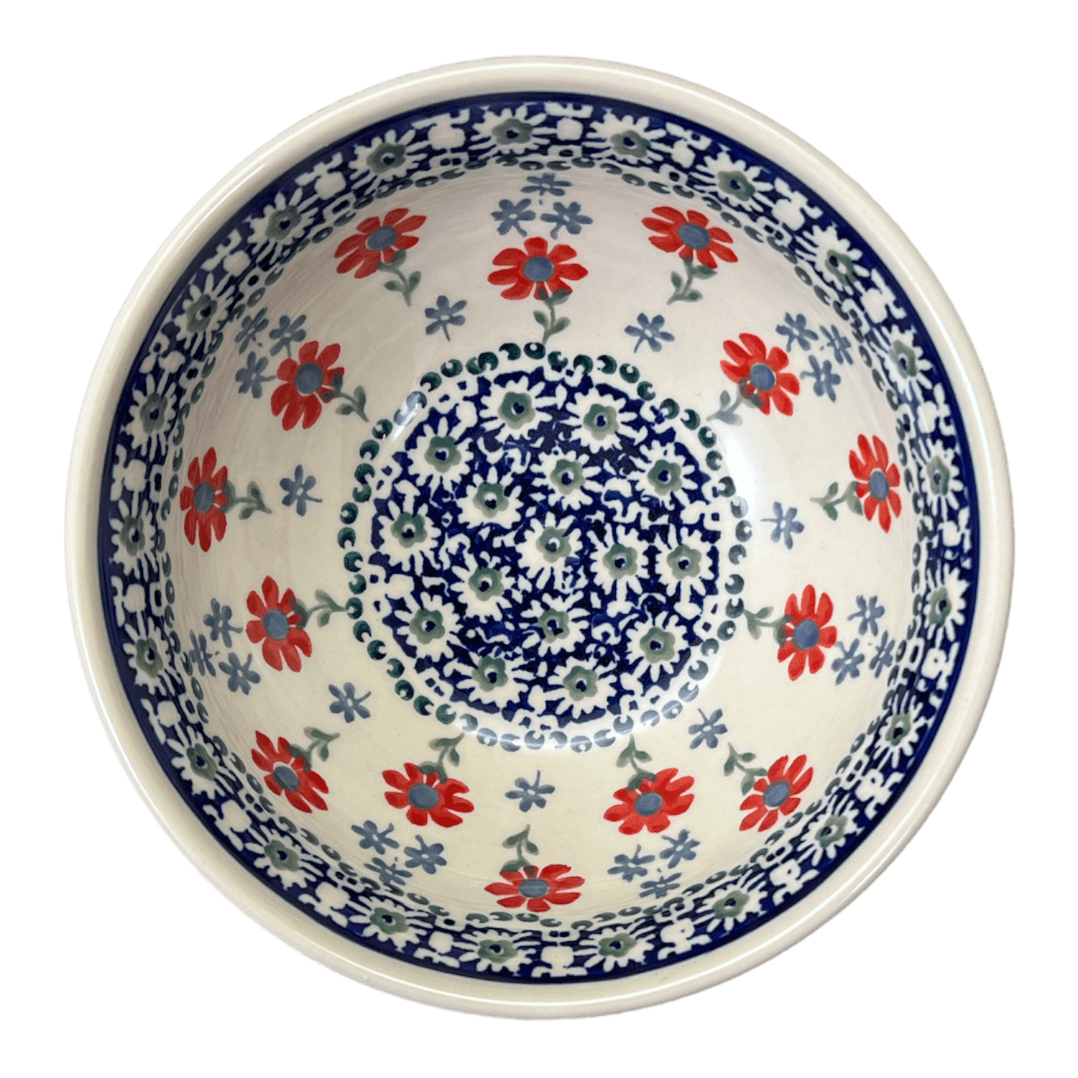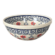Featuring the enchanting "Summer Blossoms" pattern, this bowl is a visual delight. The design incorporates beautiful flowers in a predominantly blue color, with delicate accents in white and red, and a touch of green. Each brushstroke has been meticulously hand-painted by skilled artisans in Boleslawiec, Poland, making each piece unique and special.