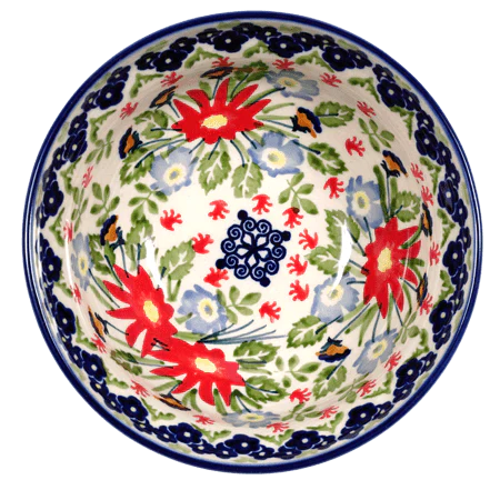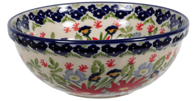 Imagine a burst of colors and the charm of a meadow captured in a bowl! The Polish Pottery Bowl from Manufaktura, measuring a versatile 6 inches, is more than just a container—it's a piece of art dubbed "Floral Fantasy". Perfect for brightening up your daily meals, this bowl is your new best friend for everything from morning cereal to that comforting late-night ice cream. The vibrant "Floral Fantasy" pattern, featuring a white backdrop interspersed with large red and yellow flowers, smaller blue and yellow blooms, and a sprinkle of tiny red blossoms amidst lush leaves, turns every meal into a festive garden party on your table.