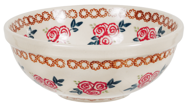 Handcrafted in the heart of Boleslawiec, Poland, this bowl is a testament to the skills of local artisans who employ the age-old "punching" technique of hand stamping. Each piece showcases a unique blend of vibrant colors and patterns inspired by nature, reflecting a story of tradition and creativity. The "Parade of Roses" pattern belongs to the Traditional category, the most recognized style in Polish pottery, known for its widespread appeal and timeless charm. Despite its simplicity, the variation in each hand-painted piece means you own a part of a larger tapestry, distinct and personally yours.