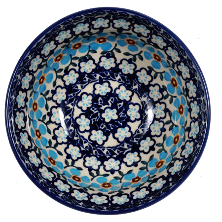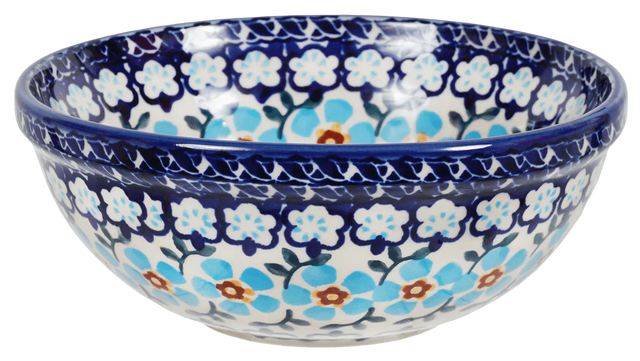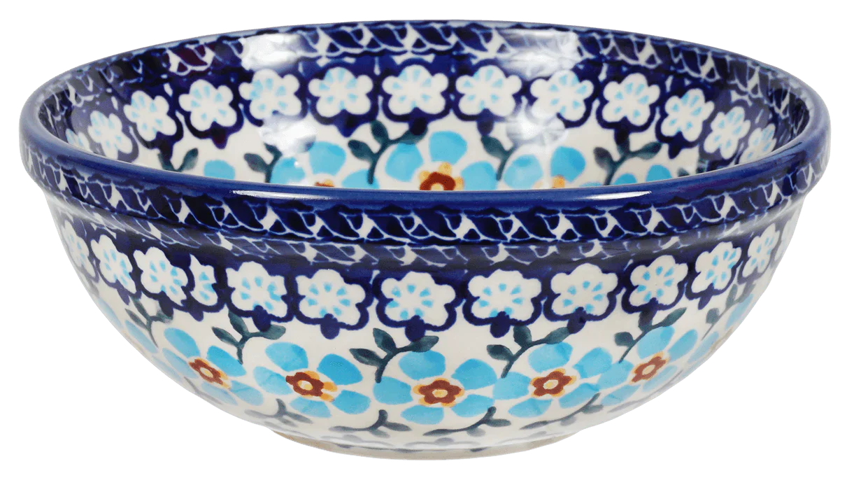 Imagine a splash of sky blue blossoms and delicate ribbon patterns gracing your table with the Polish Pottery Bowl from Manufaktura. Crafted in the picturesque town of Boleslawiec, Poland, this 6-inch round beauty isn't just a bowl; it's a piece of art. Perfect for everything from a comforting cereal breakfast to a refreshing ice cream treat, its versatile functionality is matched only by its breathtaking design. The "Sky Blue Border" pattern, a canvas of light blue hues accentuated with white and deeper blue tones, brings a serene elegance to any setting.