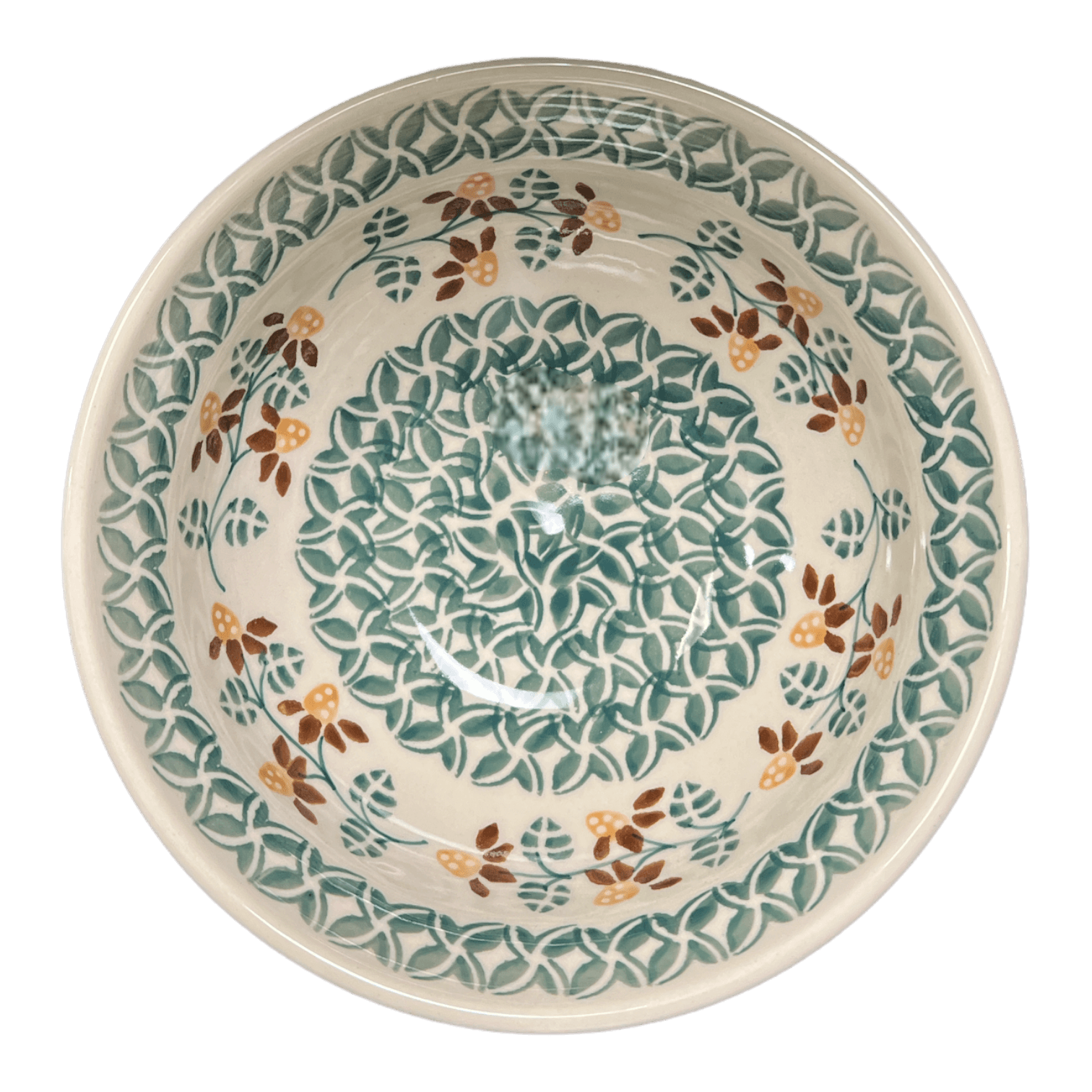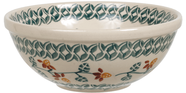 Introducing the enchanting Manufaktura Polish Pottery Bowl from the vibrant "Indian Summer" collection, a must-have for any kitchen connoisseur. Crafted in the picturesque town of Boleslawiec, Poland, this 6.75" round bowl is not just a vessel for your meals but a piece of artistry that brings the joy of Polish tradition right to your dining table. Perfect for everything from a hearty cereal breakfast to a comforting soup dinner, or even a chilled ice cream dessert, this bowl's versatility knows no bounds. Its delightful design features an intricate pattern of green and white vines tangled around a lively display of orange and brown flowers, set against a crisp white background—inviting a touch of nature into your home with every use.