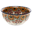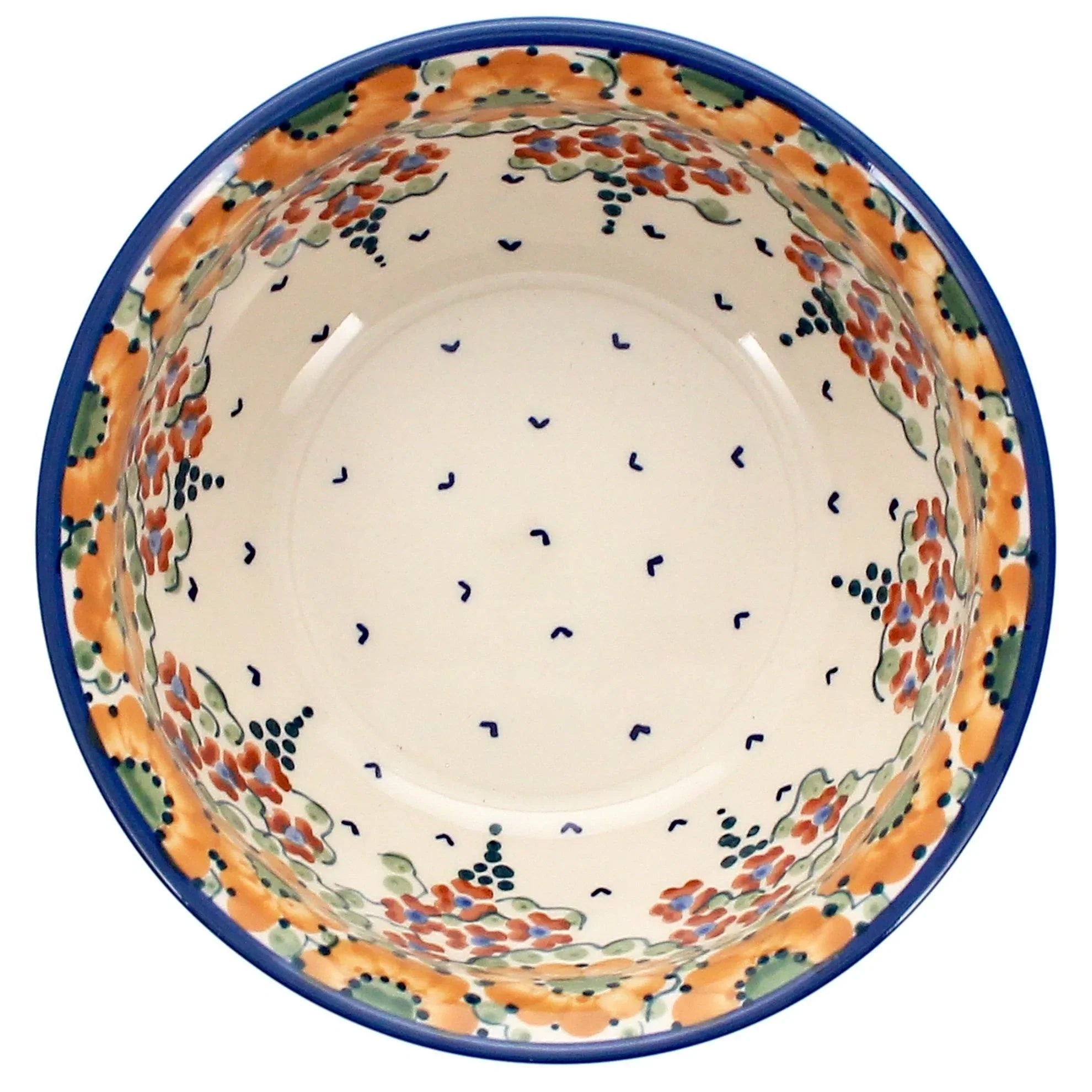 Introducing the enchanting Manufaktura Polish Pottery Bowl, a masterpiece from the heart of Boleslawiec, Poland. This delightful 7.75" bowl is not just a dish but a canvas painted with the vibrant "Autumn Harvest" pattern. Imagine a crisp autumn day as you gaze upon the intricate design featuring gold-hued flowers with white and green accents, set against a serene white background. The blue circumflexes and simple brown flowers with blue centers lead to a band of large, detailed orange flowers, each with green centers encircled by green loops. This Signature pattern, exclusive to the most accomplished artists, embodies a level of artistry that transforms every meal into a festive gathering.
